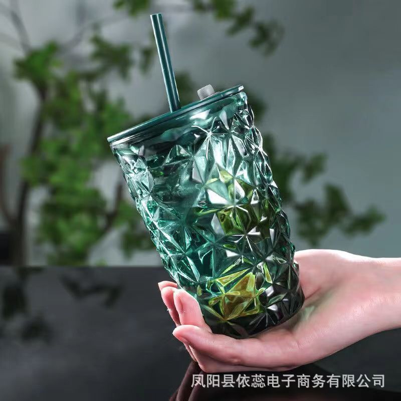 ネット赤ガラスストローカップ蓋付き墨緑ドリル模様大容量ストローカップ女子学生がすぐにコップミルクカップを飲む
