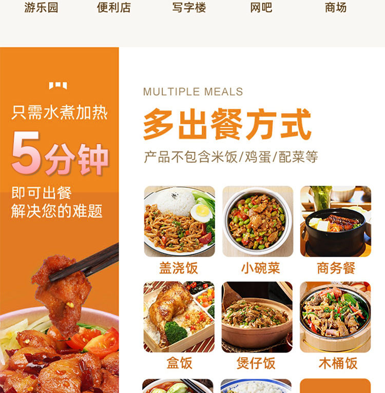 食事用調理パッケージ、ケータリング、業務用ファーストフード、丼ご飯、冷凍半製品、加熱してすぐに食べられる既製料理、クイック料理