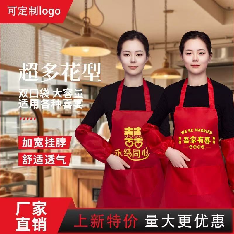 结婚围裙批发广告红色厨房套袖印字logo生日寿宴婚宴礼品喜事围裙