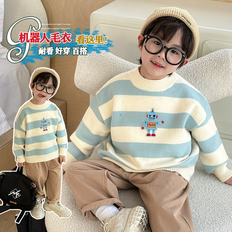子供服 秋の新作 男の子 韓国風ストライプ柄 万能ニットセーター 漫画風可愛い丸首セーター トップス