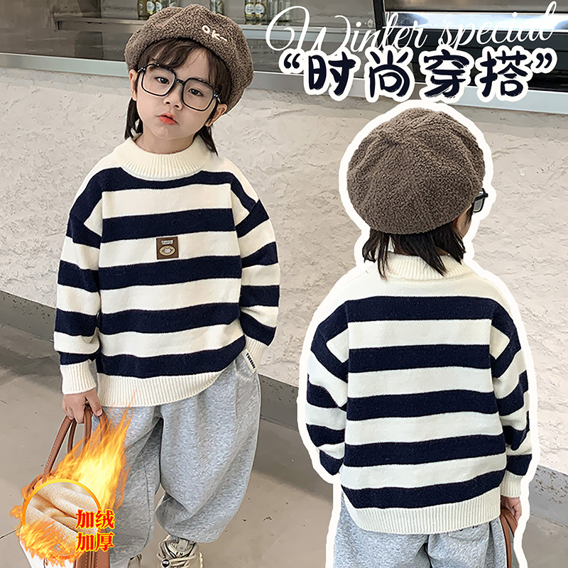 子供服セーター秋冬ストライプ2024韓国風コントラストカラープルオーバーベビーニットトップス裏起毛厚手