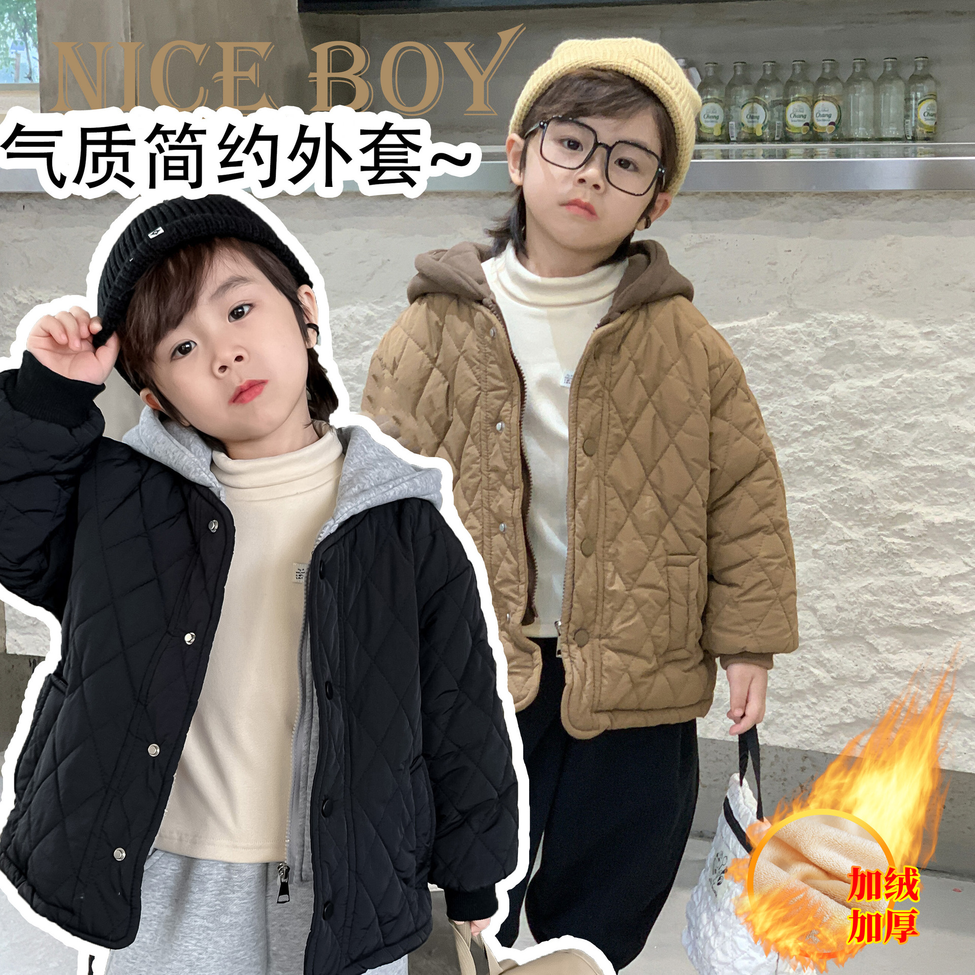 男女兼用ベビー菱格柄秋冬フード付き綿服、裏起毛・厚手、新作子供用綿服、フェイクツーピース綿服ジャケット