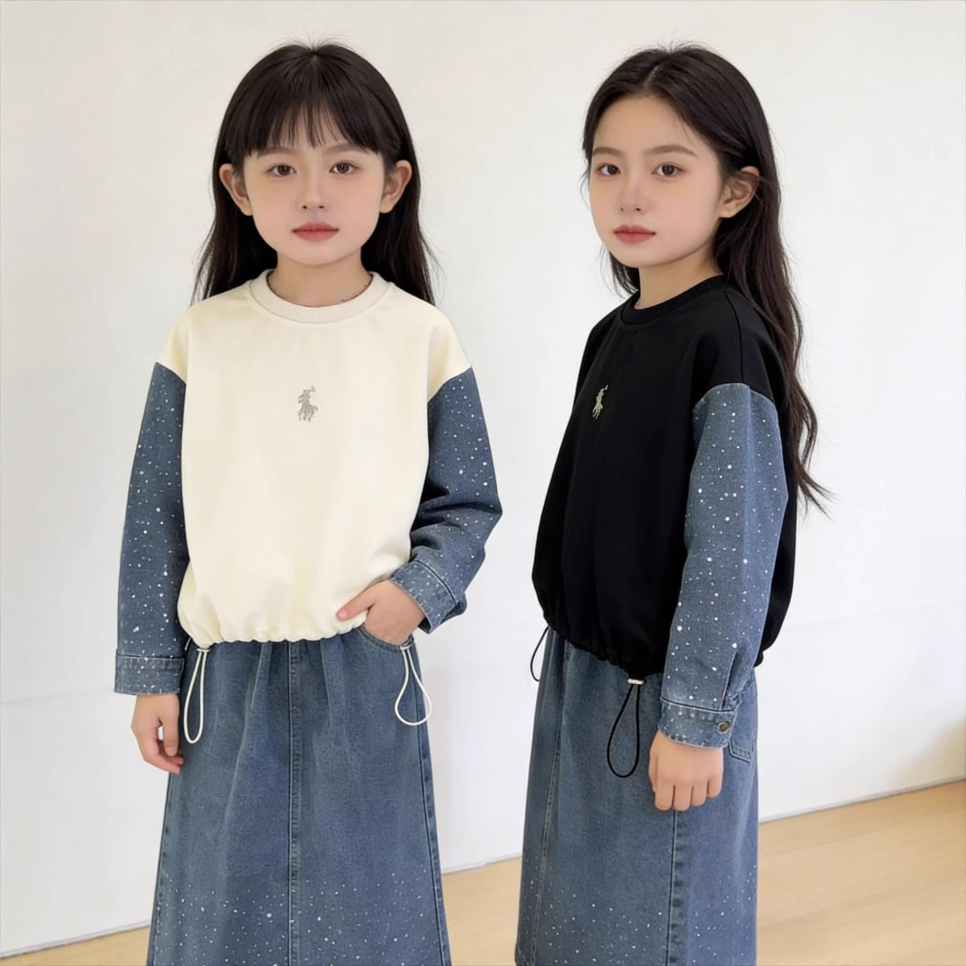 牛仔半身裙女孩秋冬2026新款牛仔拼接卫衣套头上衣中长裙两件套