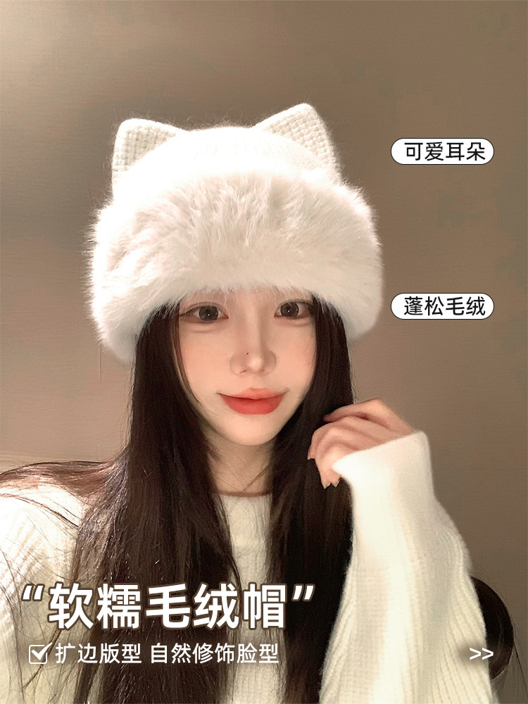 可爱猫耳朵针织毛线帽女秋冬季韩系百搭保暖毛绒显脸小护耳帽子潮