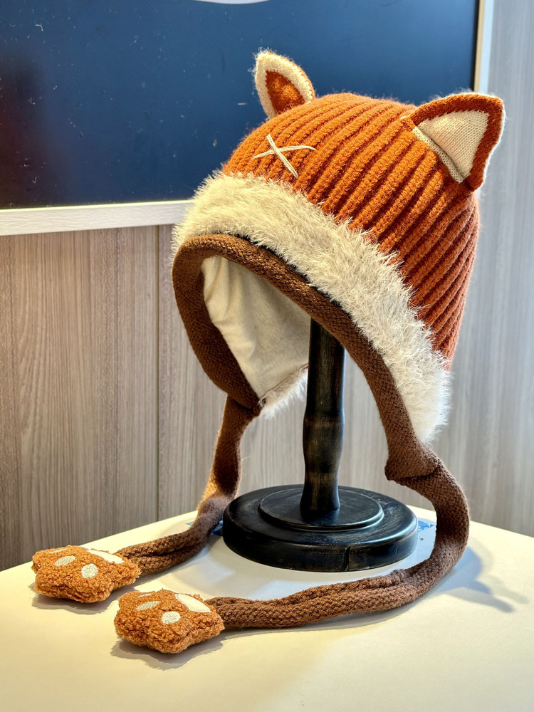 2025新款可爱狐狸针织毛线帽子女秋冬季保暖护耳加厚双层猫爪帽