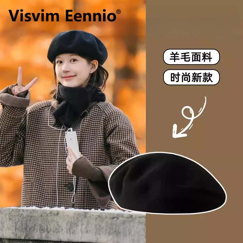 赵露思同款黑色纯羊毛大头围贝雷帽女秋冬高级感显脸小画家蓓蕾帽