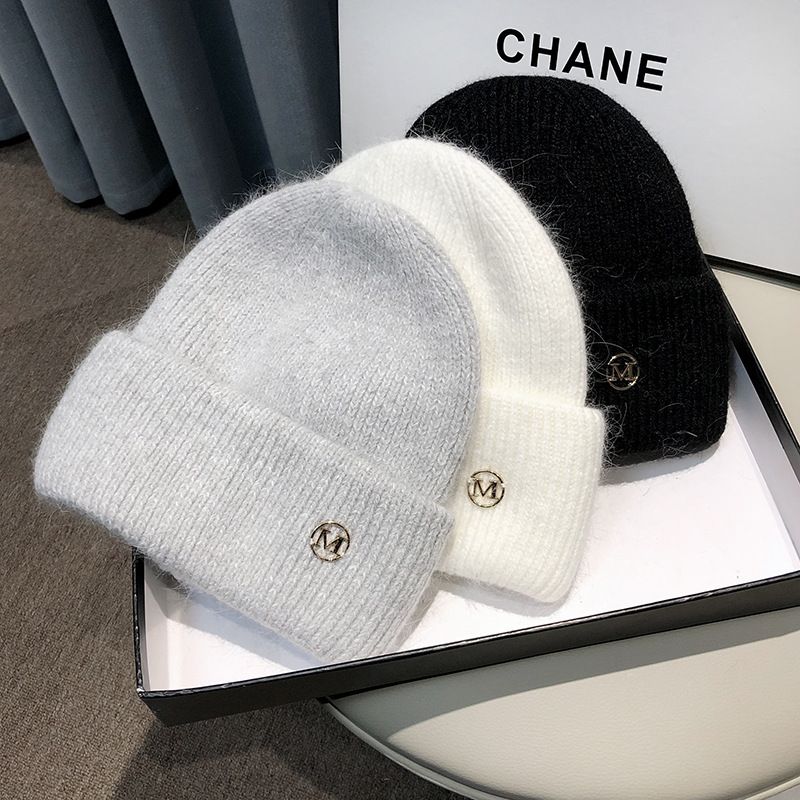 アルファベット「M」ロゴ入りウサギ毛帽子 レディース 秋冬万能 厚手 暖かい 耳当て付き ニット帽 ショッピング用 防寒帽子 円錐形耳当て付き