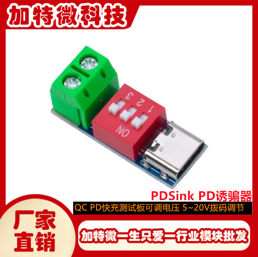 PD诱骗器支持PD3.0/2.0,BC1.2等升压快充协议,最高支持100w功率,并且提供过温、过压保护等功能。电压可通过拨码开关调节,输出电压最高20V。
