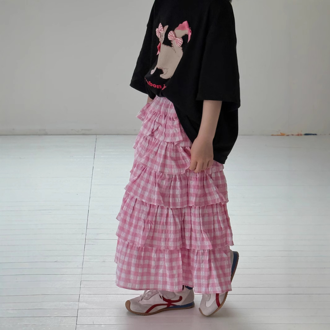 子供用スカート 2026夏モデル 女の子用 韓国風チェック柄パッチワークスカート 子供用カジュアル万能パフスリーブプリンセススカート