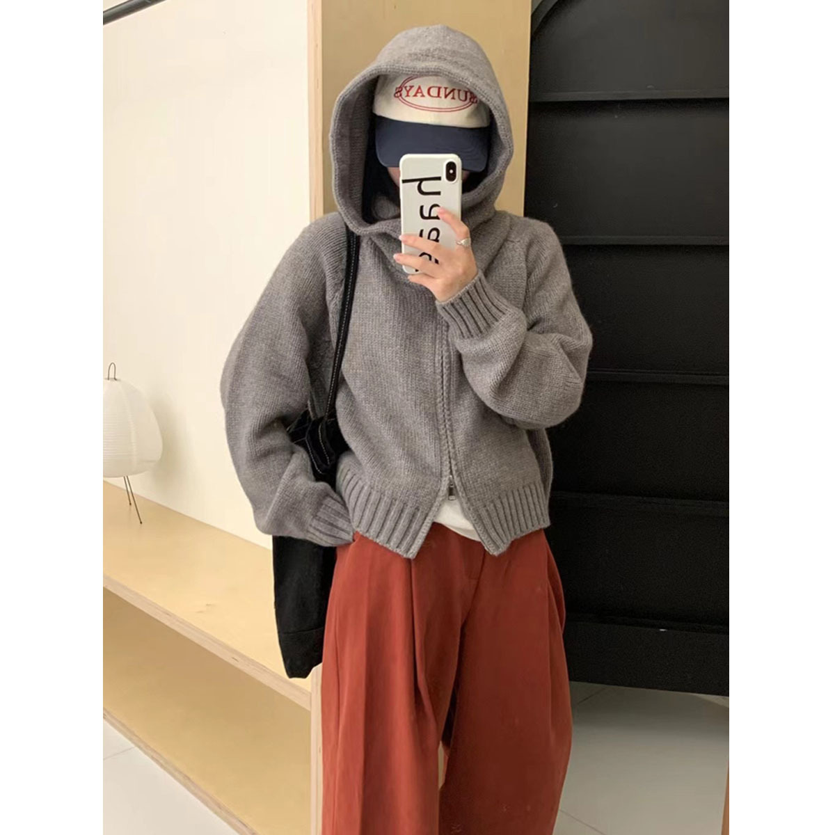 安婷露秋冬新品重磅高克重慵懒风连帽开衫女双拉链针织毛衣外套女