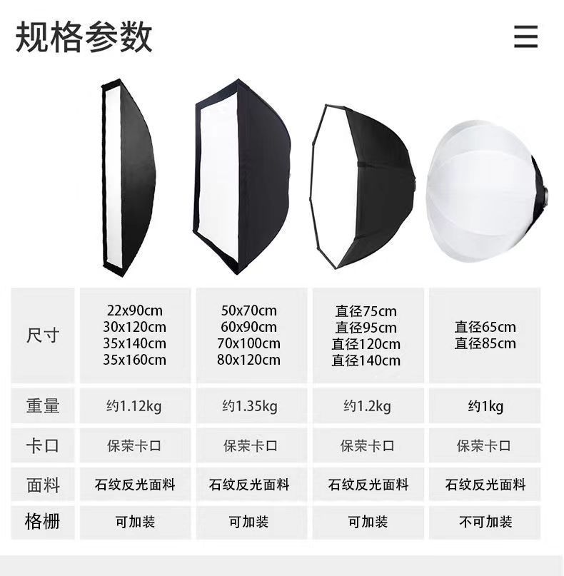 65cmランタンボール(強化ナイロンチャック),65cmランタンボール(フルメタルチャック),60*90 四隅ソフトボックス (フルメタルチャック),60*90 四隅ソフトボックス + グリル (フルメタルチャック),95cm八角形ソフトボックス(フルメタルチャック),95cm八角形ソフトボックス+グリル(フルメタルチャック),30*120 ロングソフトボックス + グリル (フルメタルチャック),深さ70cmの放物線+グリル(フルメタルチャック),深さ90cmの放物線+グリル(フルメタルチャック),深さ120cmの放物線+グリル(フルメタルチャック)