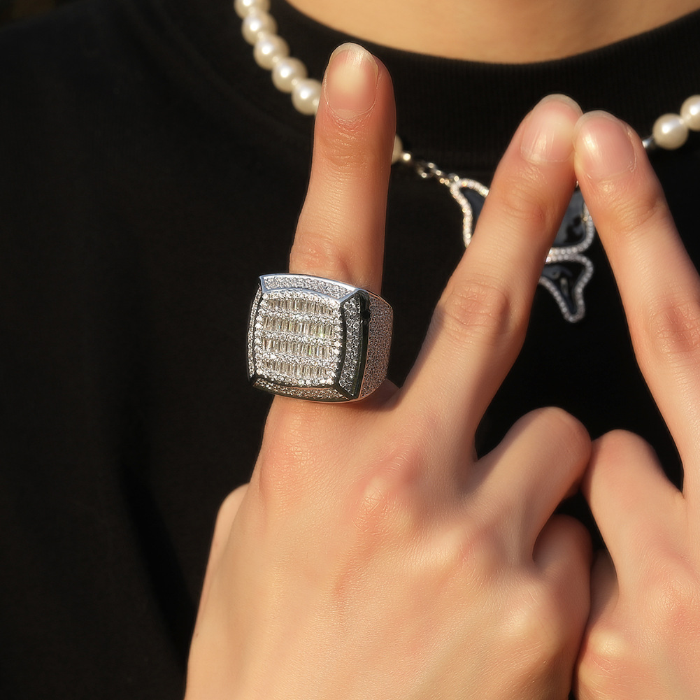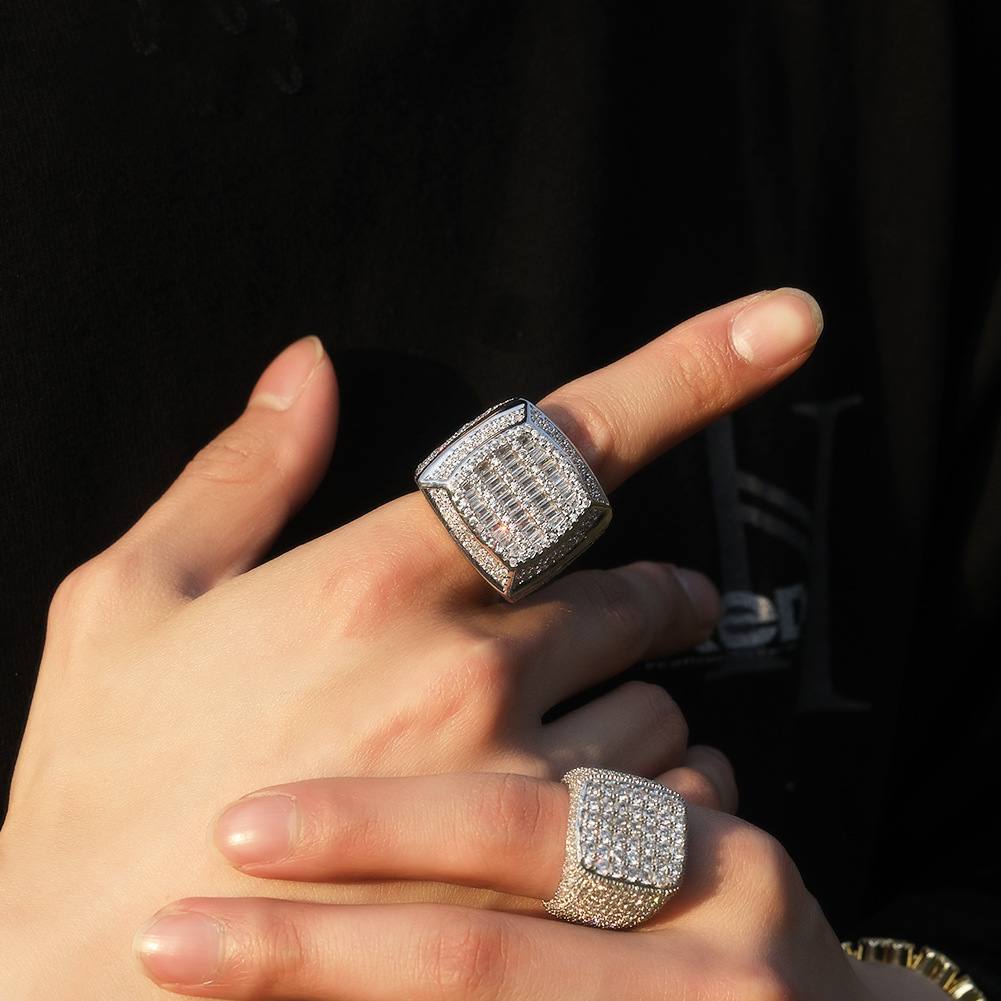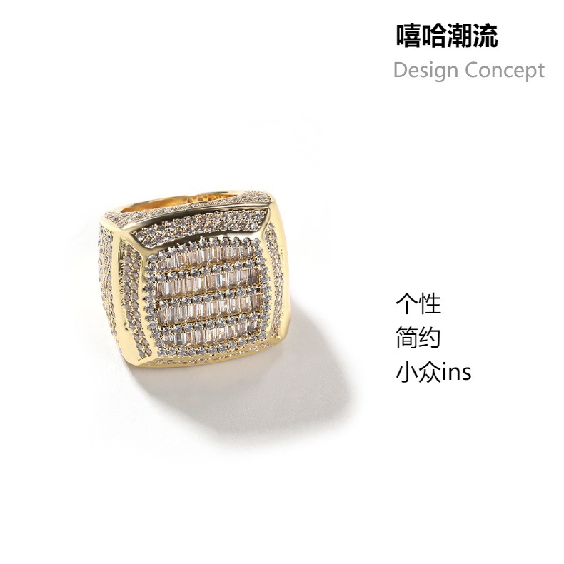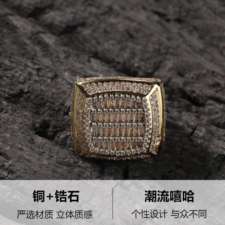 新しいレトロなスクエア型のダイヤモンドがちりばめられたヒップホップリング、男性用、個性的で威圧的な人差し指リング、ニッチでトレンディな指輪