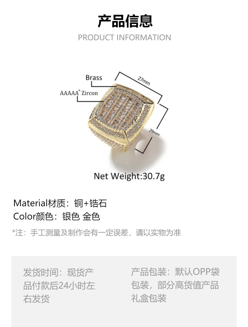跨境新款嘻哈混镶T方白锆指环 男士小众个性饰品满钻方形霸气戒指