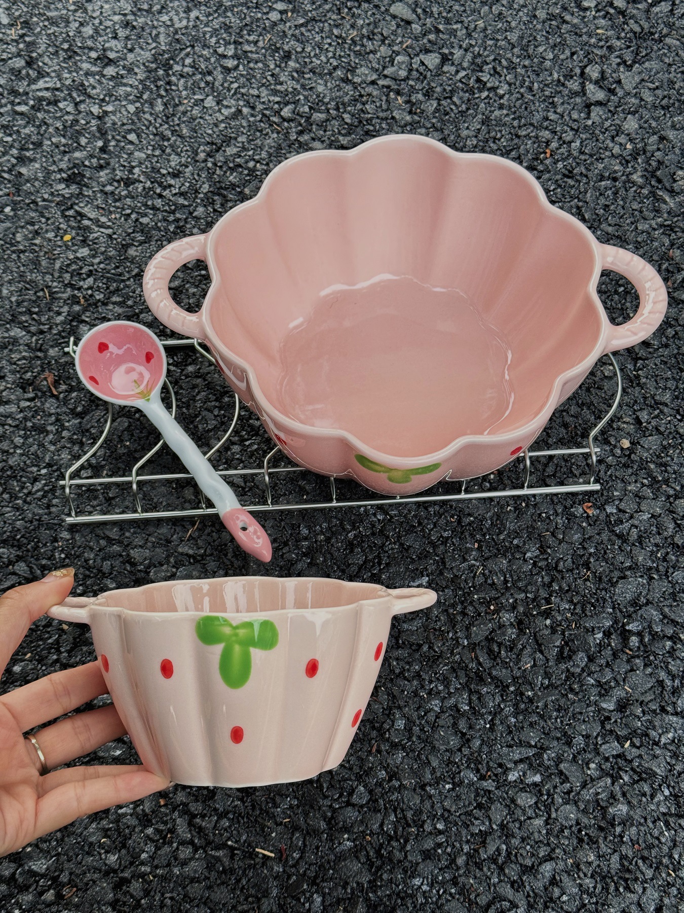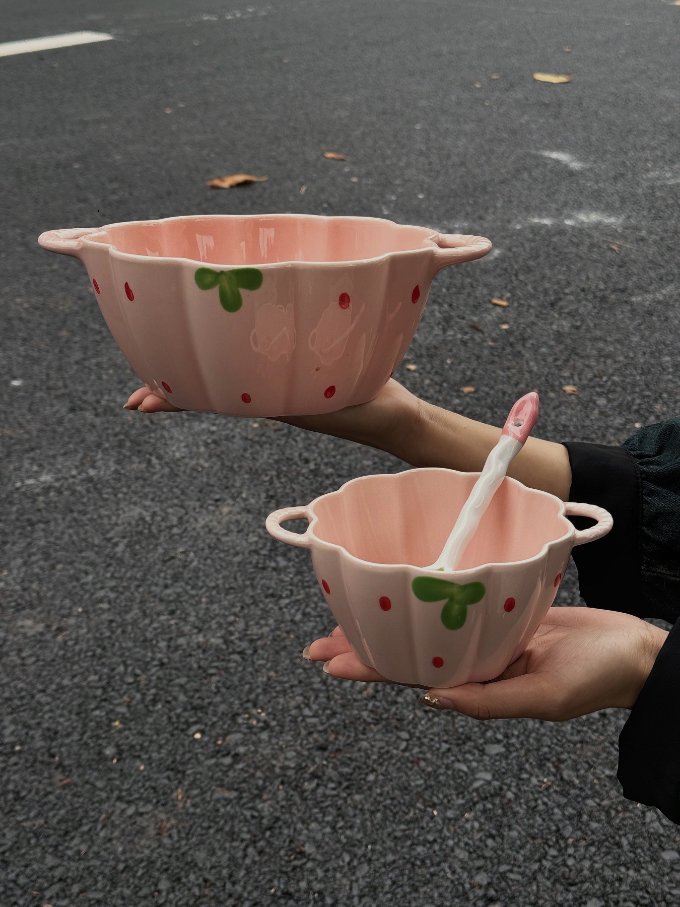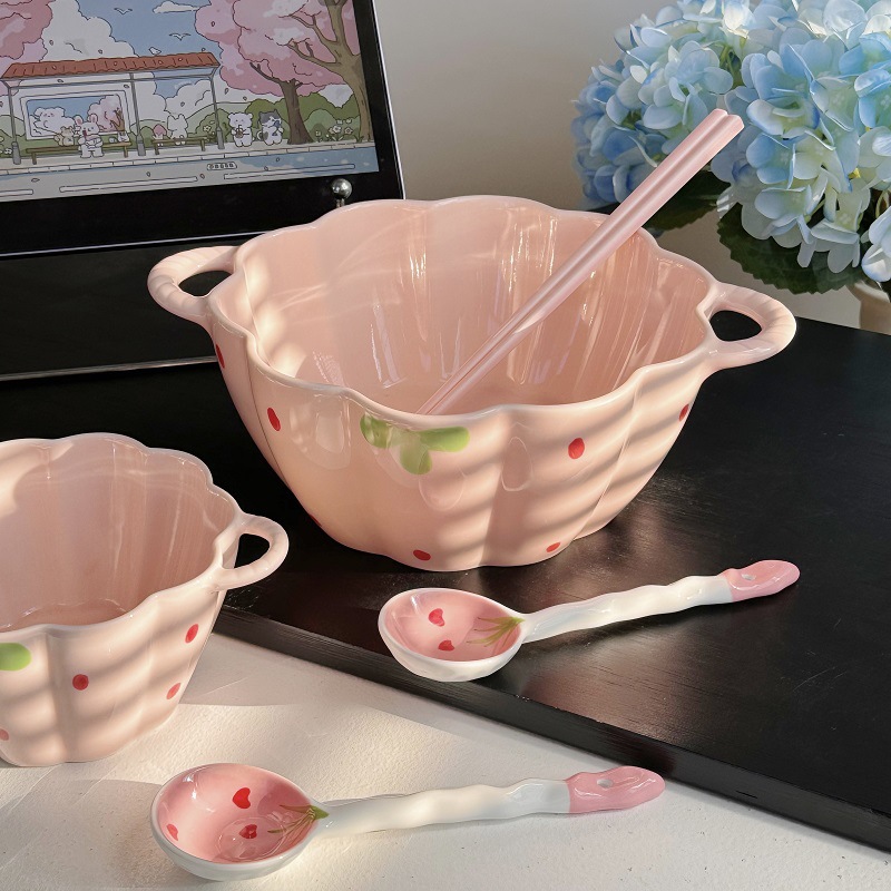 草莓釉下彩碗家用陶瓷碗盘套装可爱一人食餐具饭碗手柄碗汤碗盘子