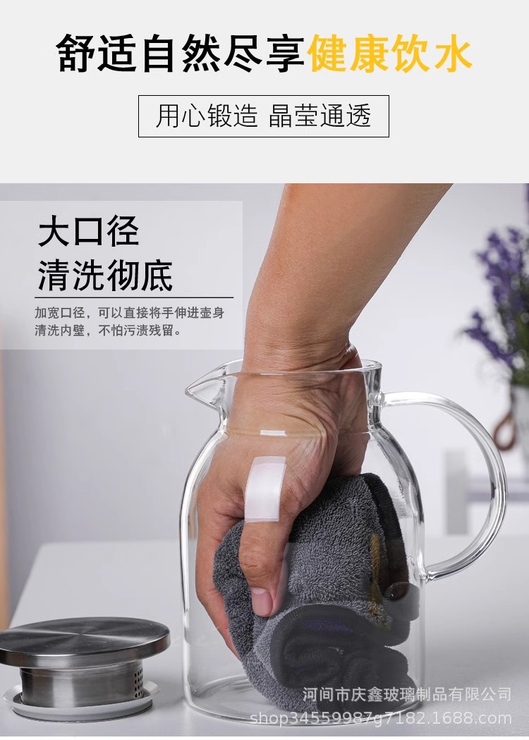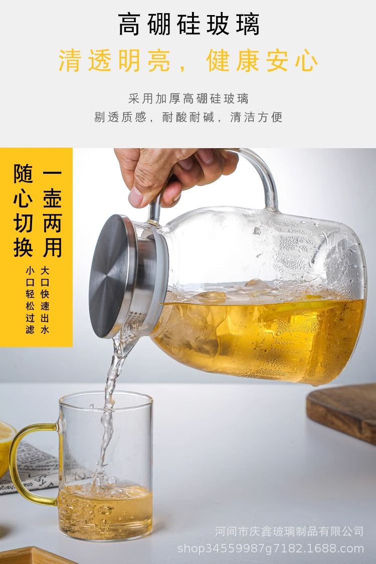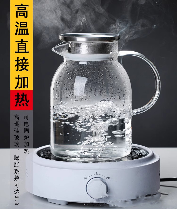 現物は直接に火を出すことができます。耐熱冷水ポットの高ホウ素シリコンガラスポット家庭用冷水大容量直火水筒です。