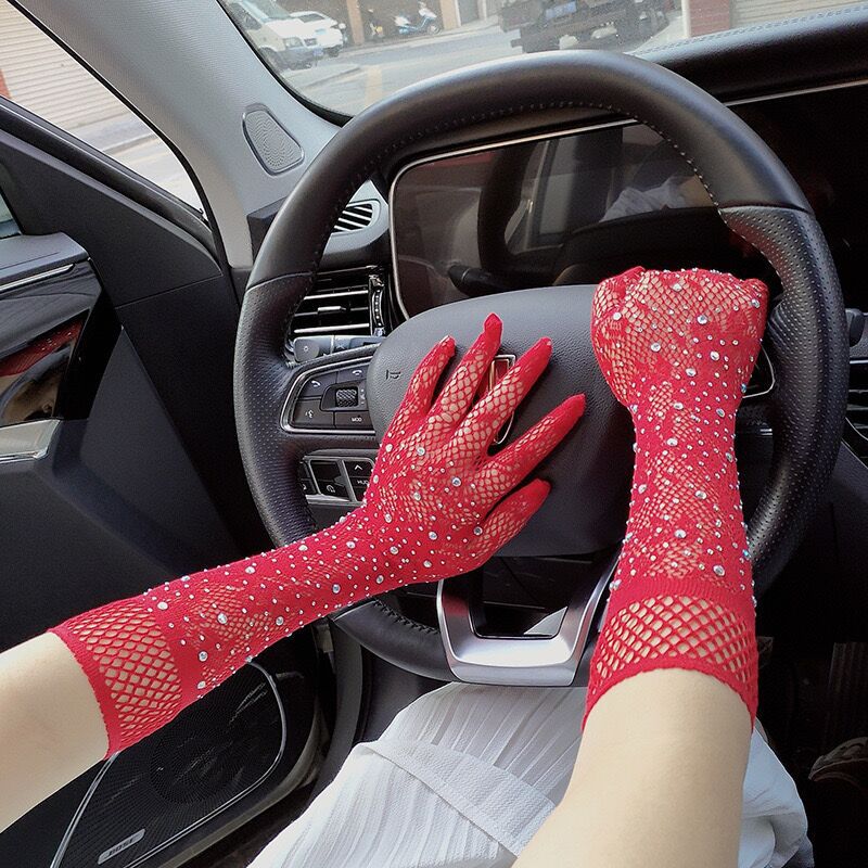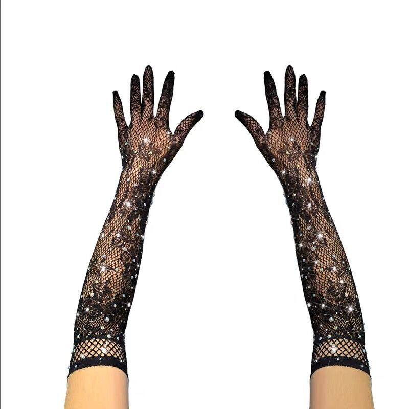 ラインストーン付きフィッシュネットジャカード弾性手袋、セクシーレース織り花柄メッシュ、キラキラ輝くラインストーン付きナイトクラブダンス用エロティックアクセサリー(大人用)