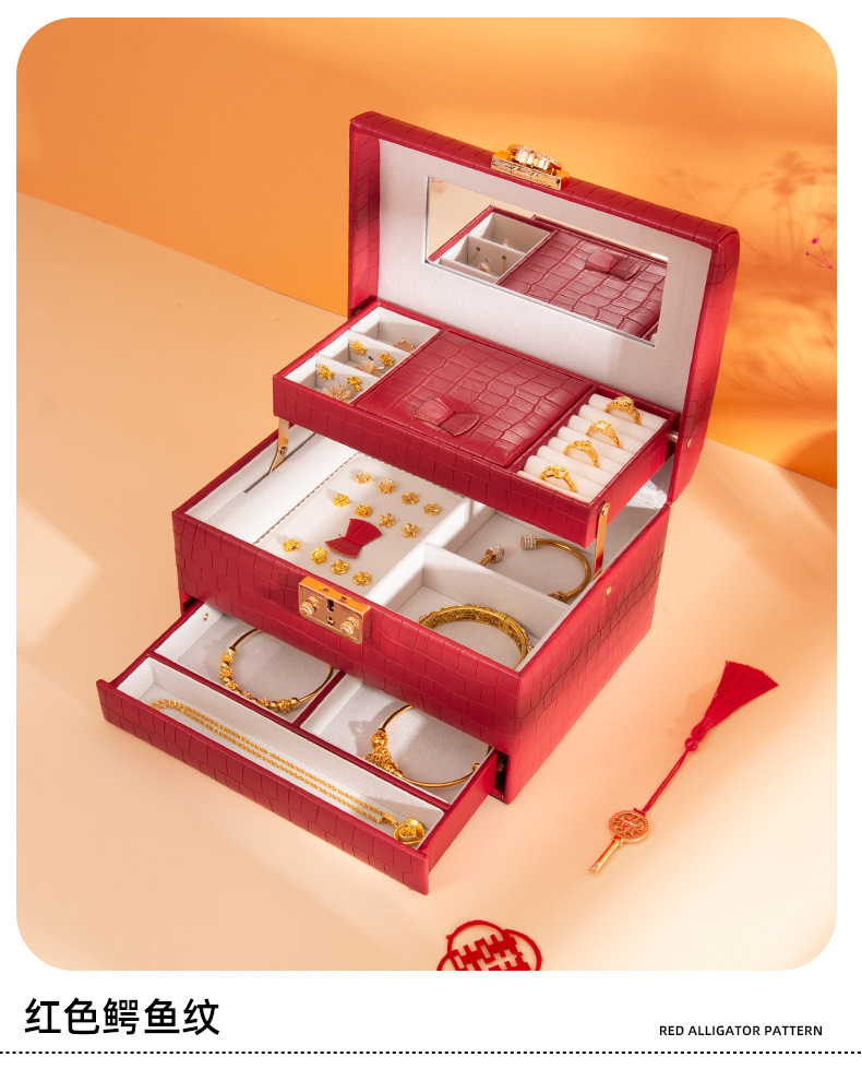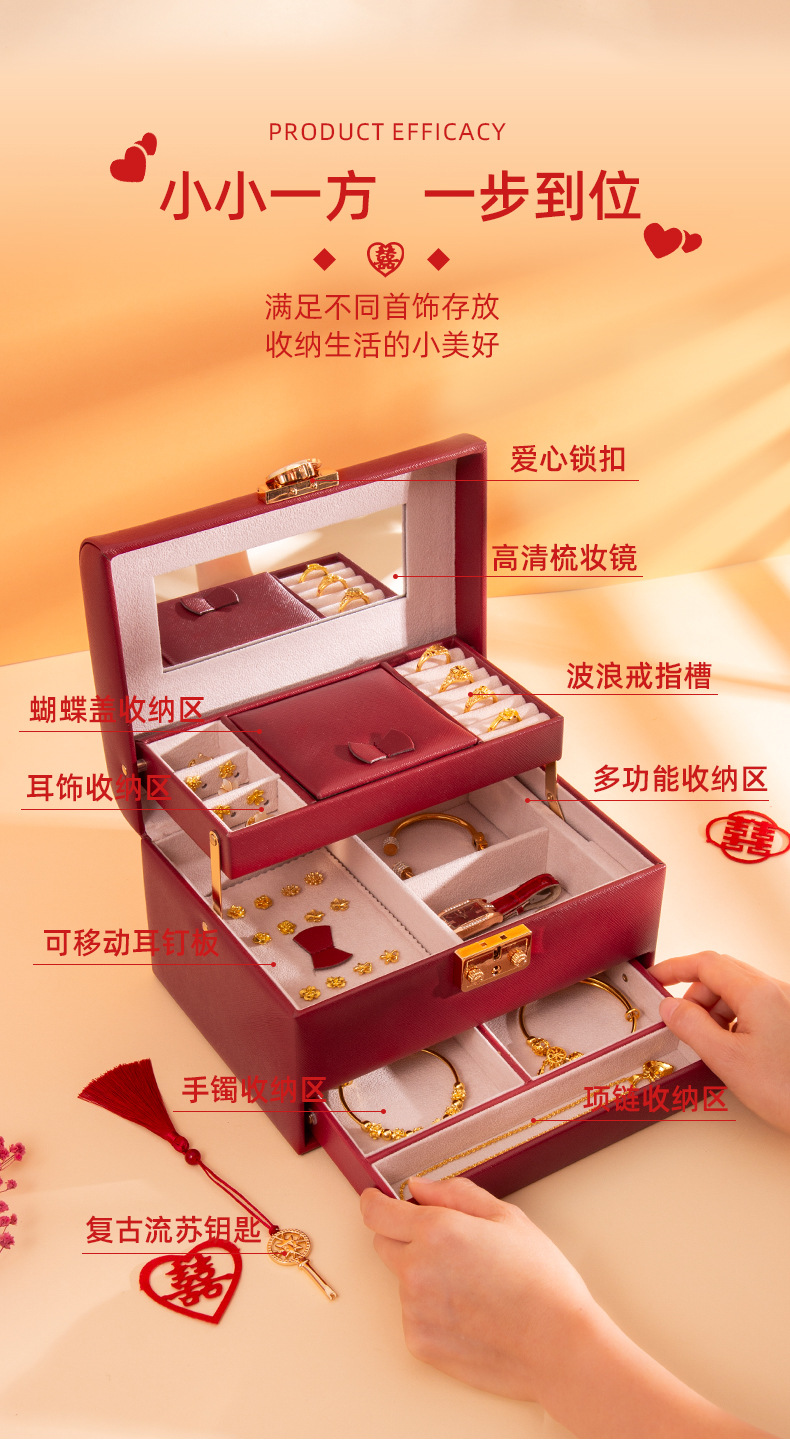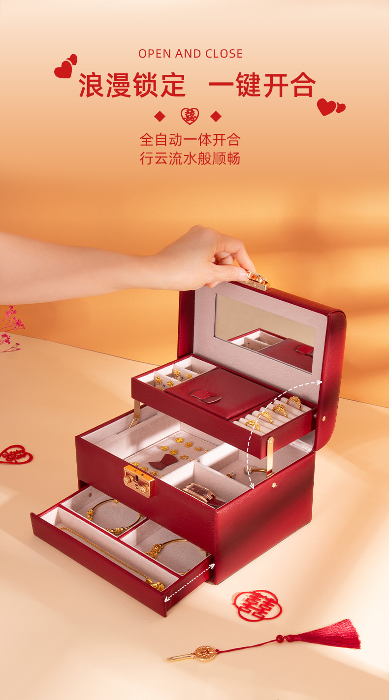 新しいスリーゴールドハードウェアウェディングジュエリーボックスロック付きハイエンドジュエリー収納ボックスリングブレスレットネックレスオーガナイザー