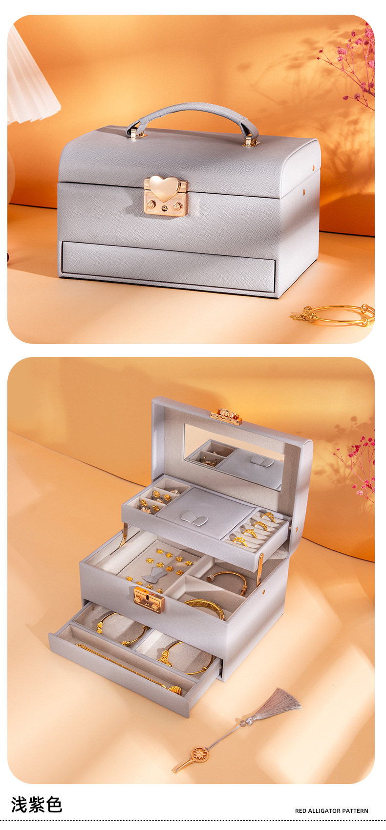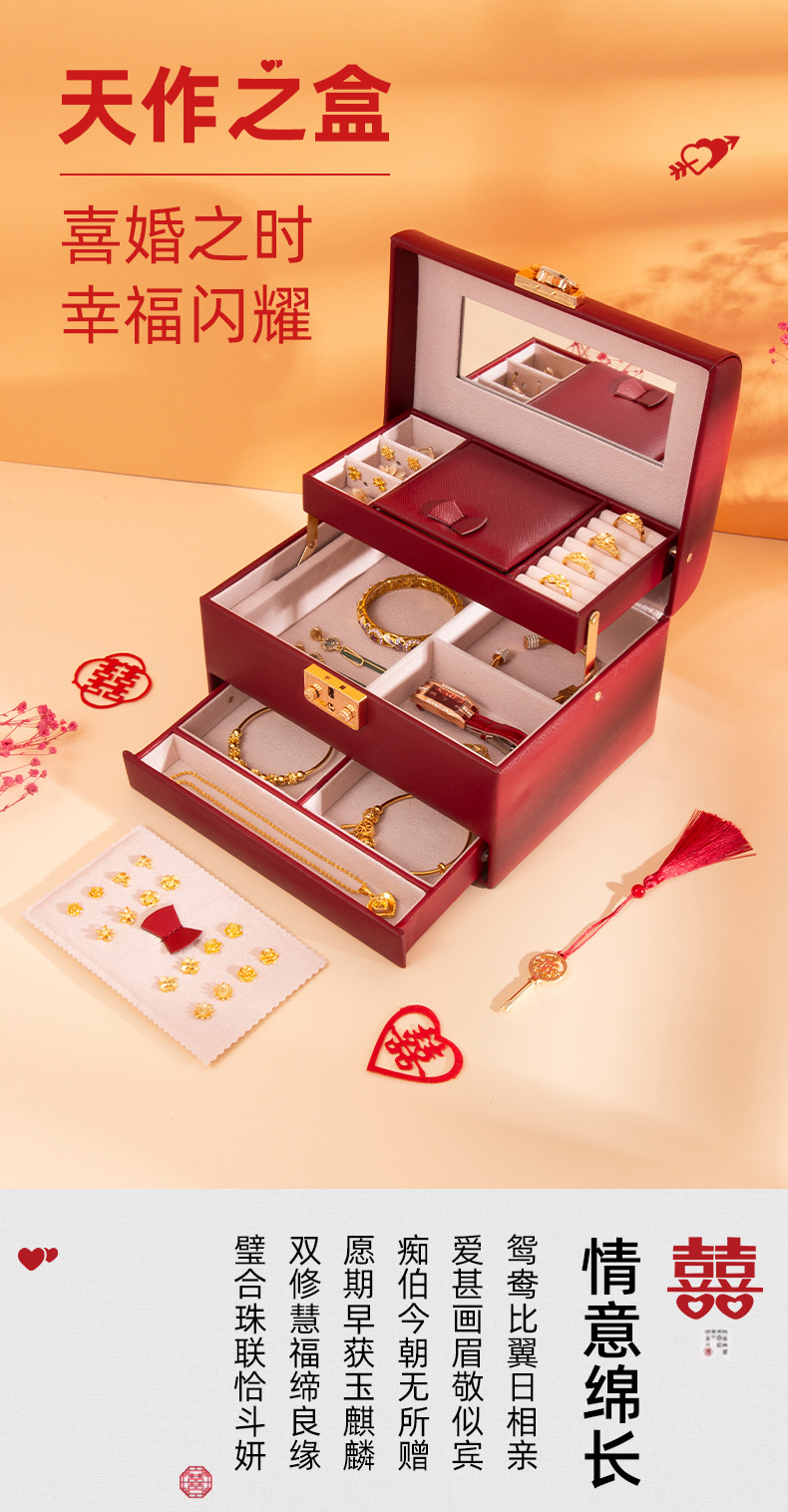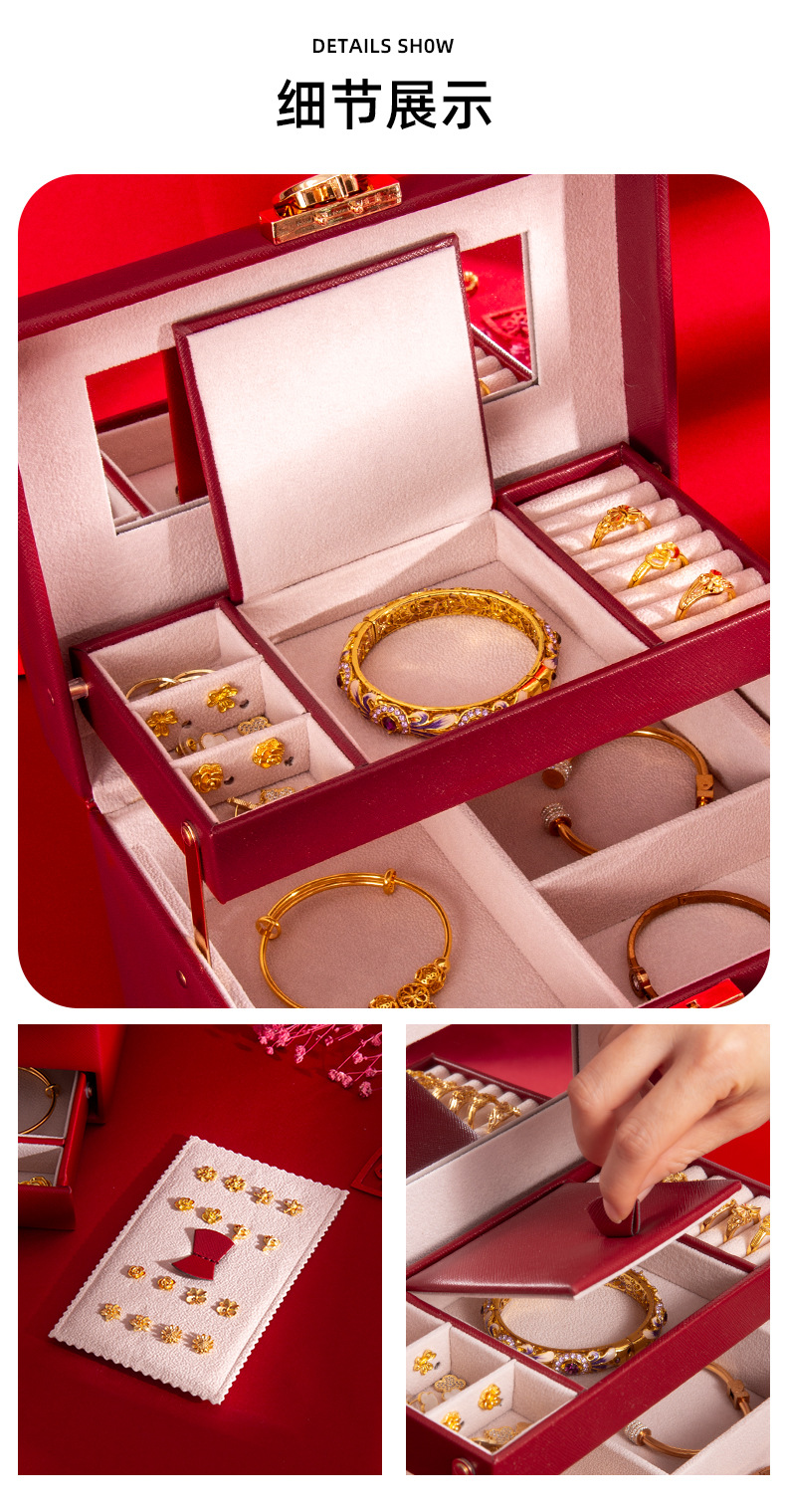 新しいスリーゴールドハードウェアウェディングジュエリーボックスロック付きハイエンドジュエリー収納ボックスリングブレスレットネックレスオーガナイザー