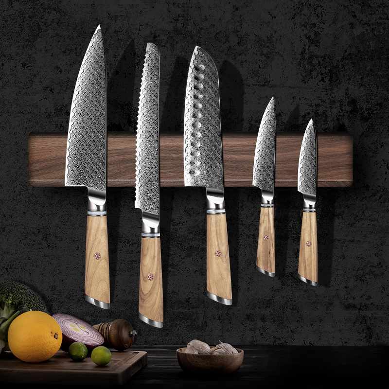 クルミ材の壁掛け式包丁ホルダー、壁に穴を開ける必要がある、キッチン用、家庭用、磁気式包丁収納ハンガー、磁気吸着式