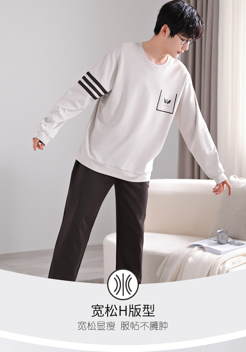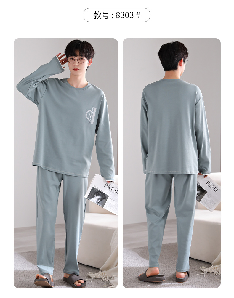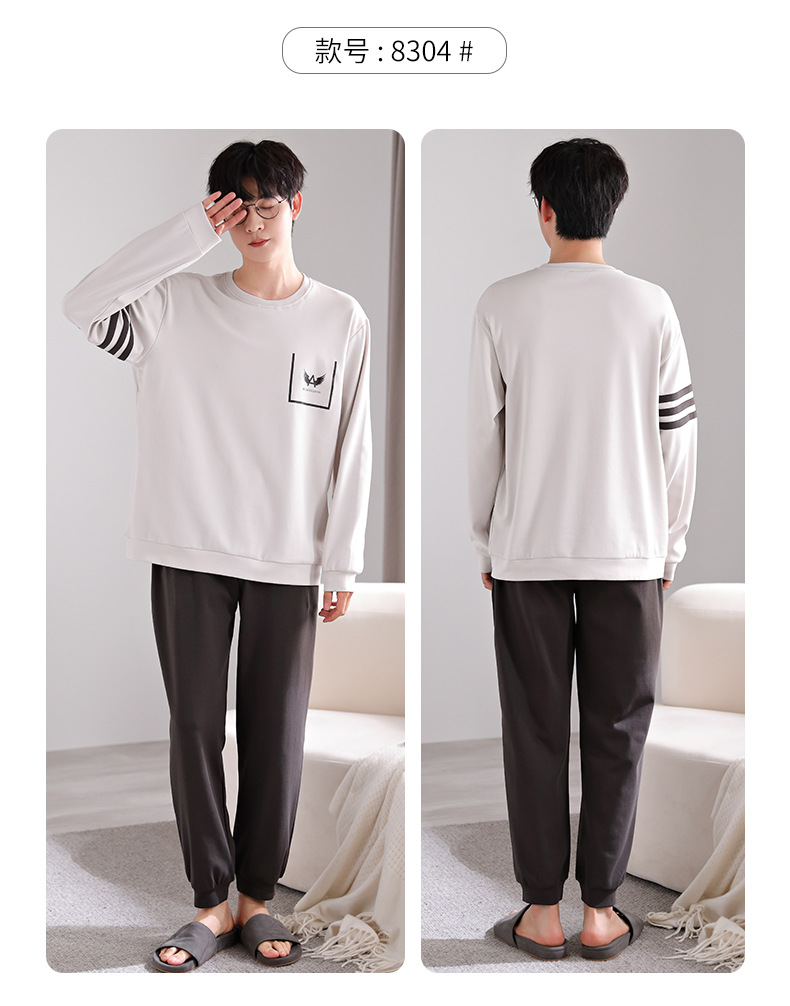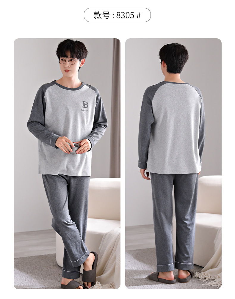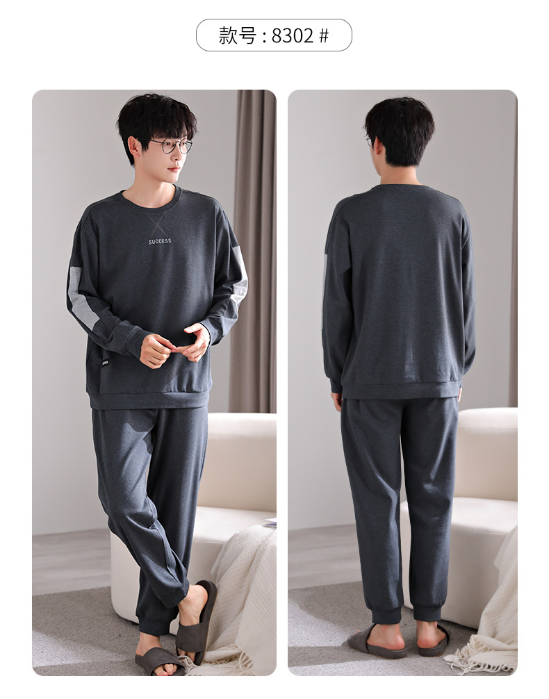 男性パジャマ春と秋の新型丸首カジュアルサイズは春の純綿の家庭服長袖ズボンセットを着ることができます。