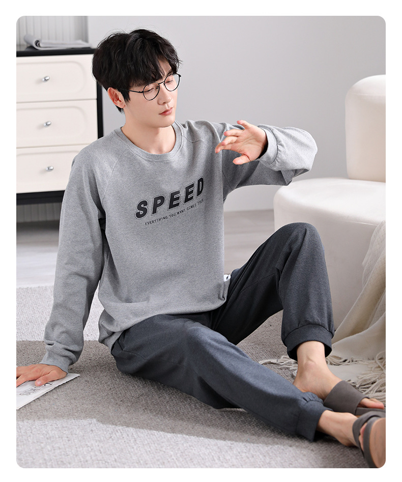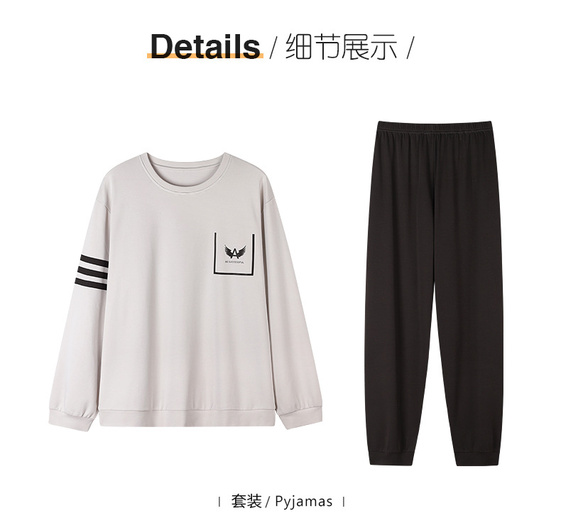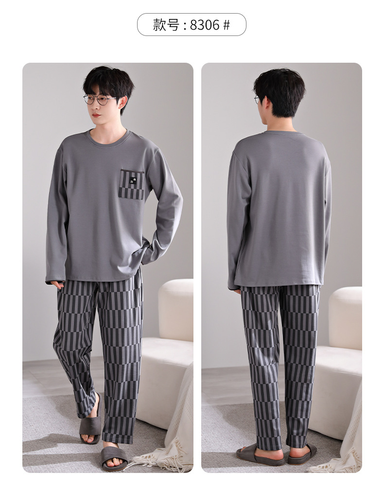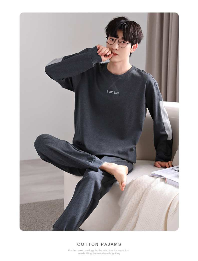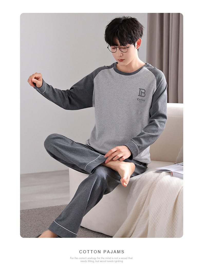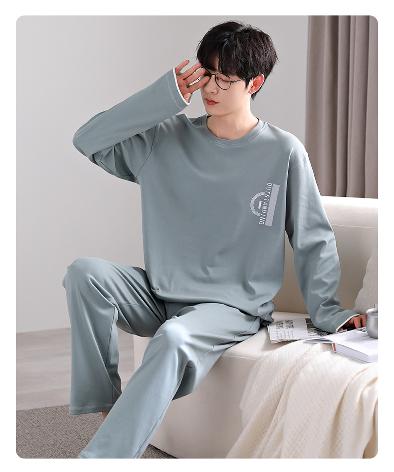 男性パジャマ春と秋の新型丸首カジュアルサイズは春の純綿の家庭服長袖ズボンセットを着ることができます。