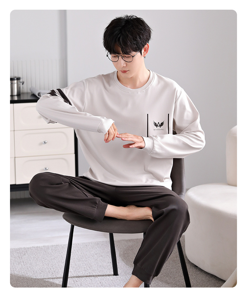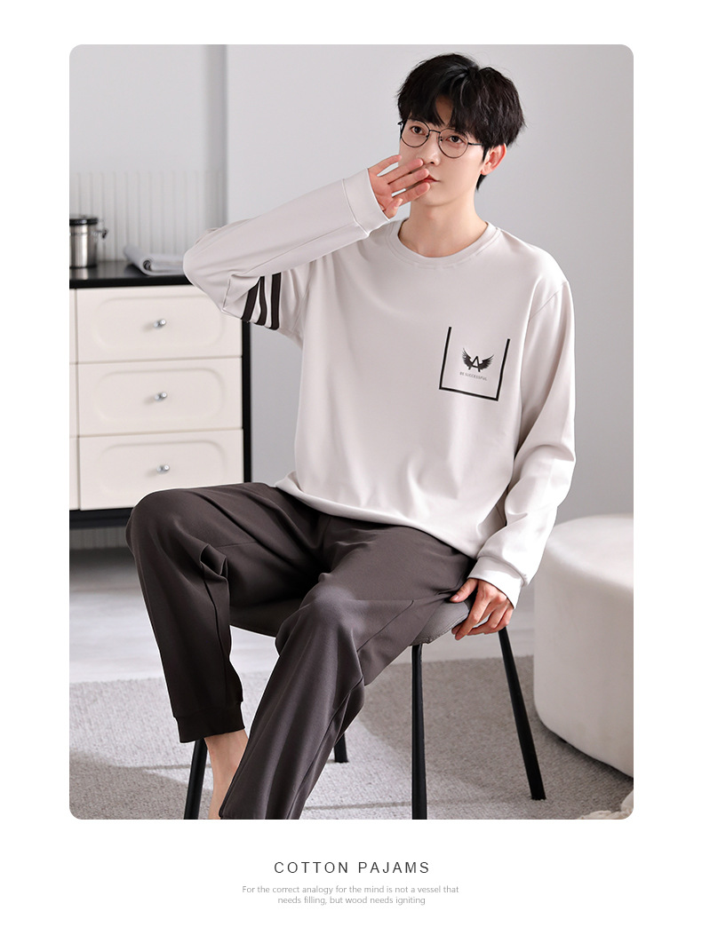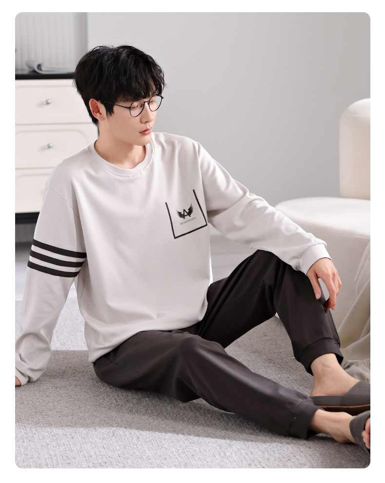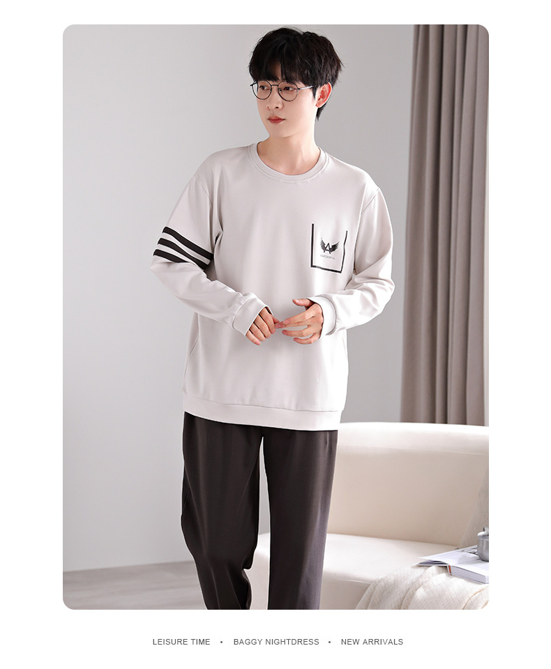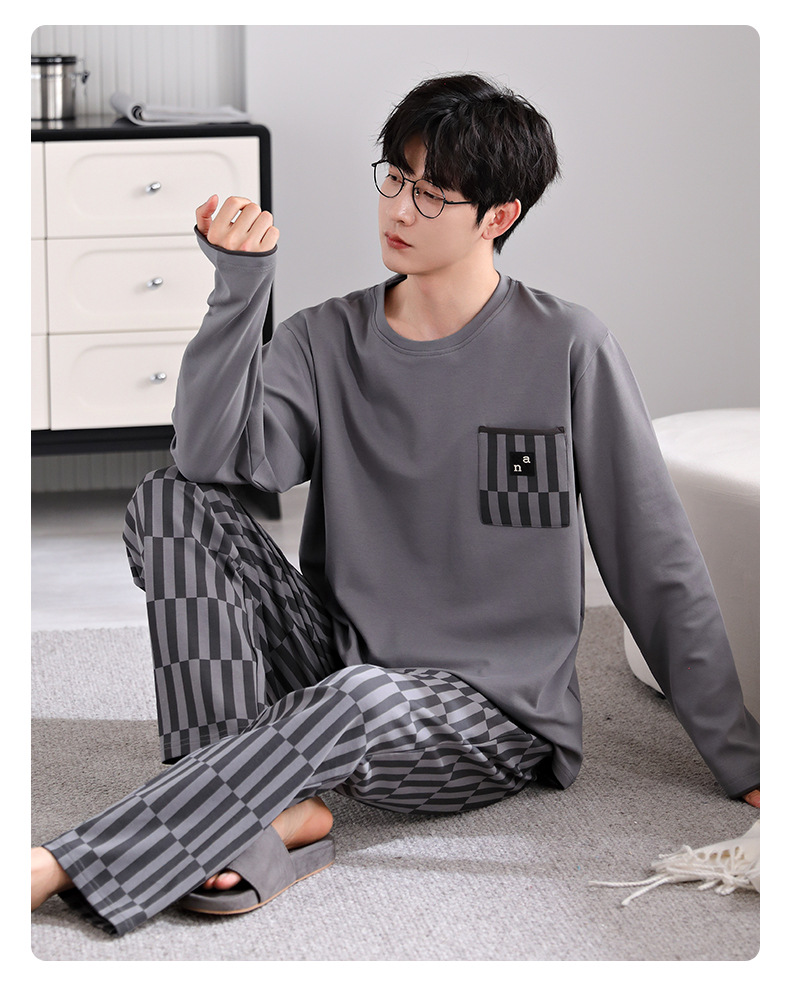 男性パジャマ春と秋の新型丸首カジュアルサイズは春の純綿の家庭服長袖ズボンセットを着ることができます。