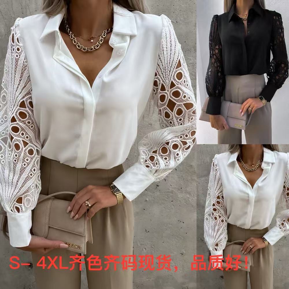 2025 アマゾンヨーロッパとアメリカの国境を越えた春と夏の新しい売れ筋の女性の無地レーススプライシングシャツシャツ女性のための