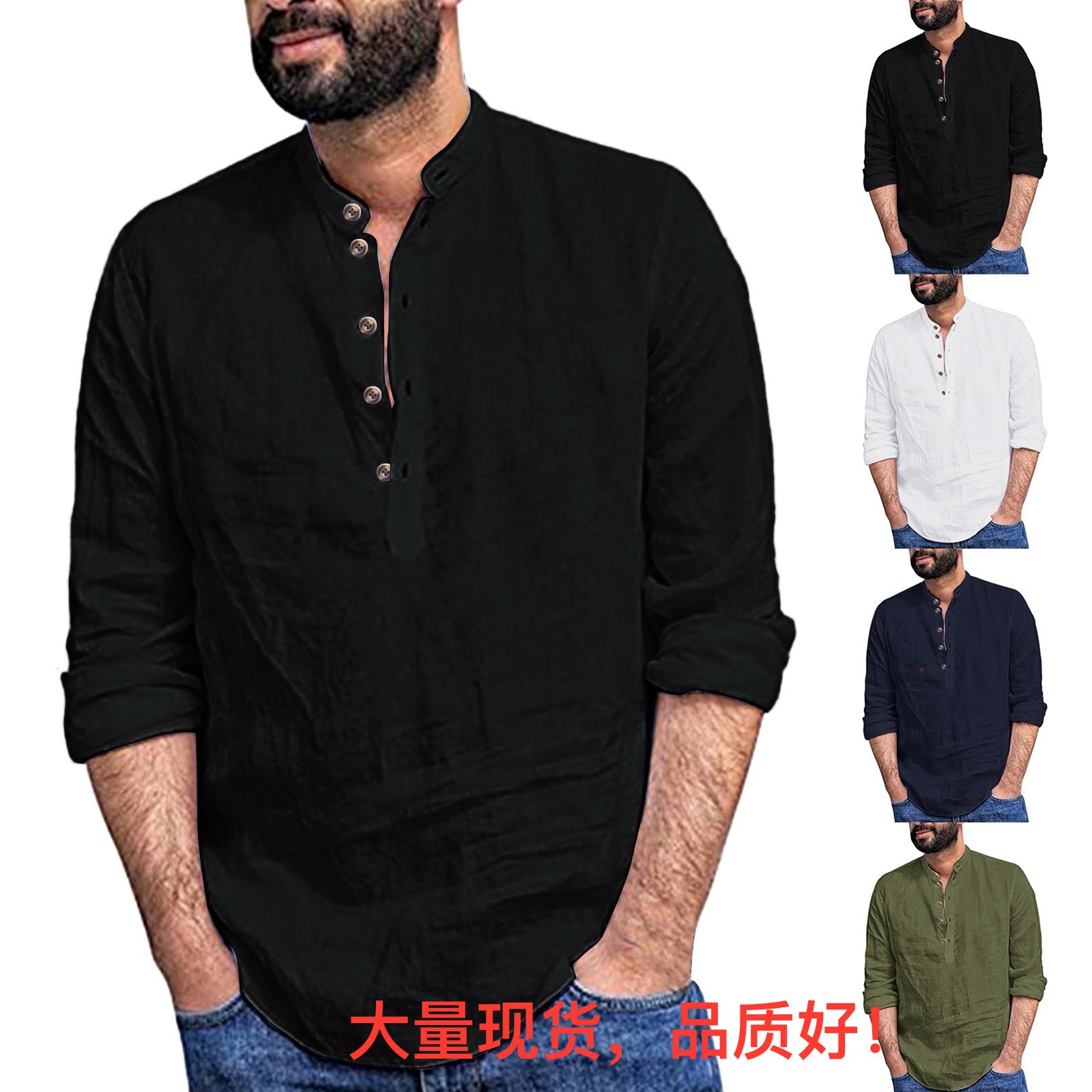 2025越境カジュアル男性ゆったりシャツ男性潮立襟綿麻長袖色独立現物駅