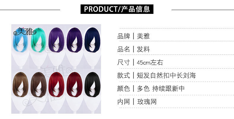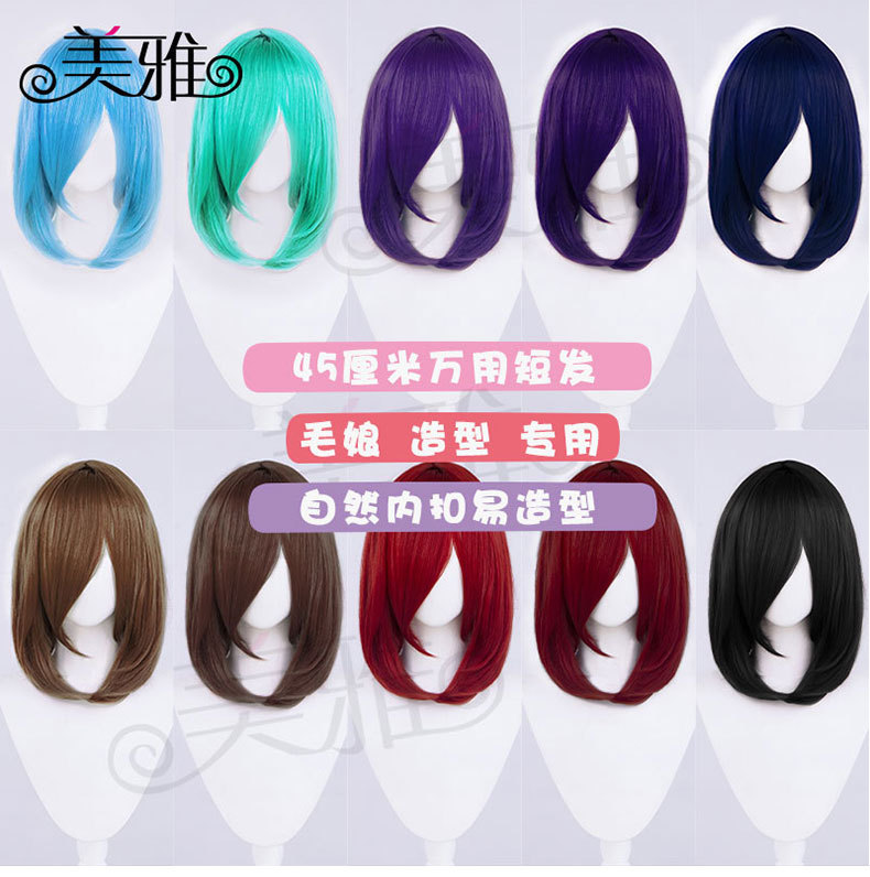 万能内ボタンコスプレかつら35cm短髪顔偽毛黒白黄青粉カラー卸売り