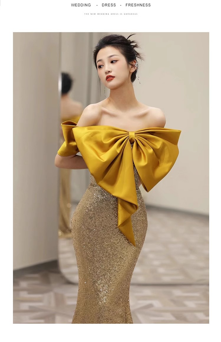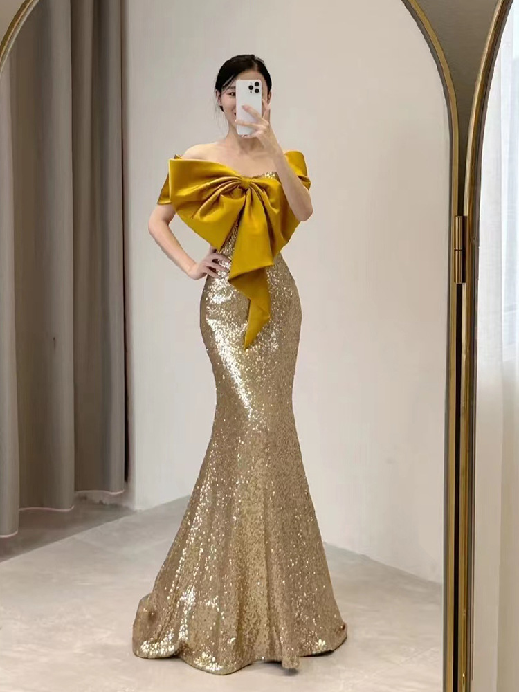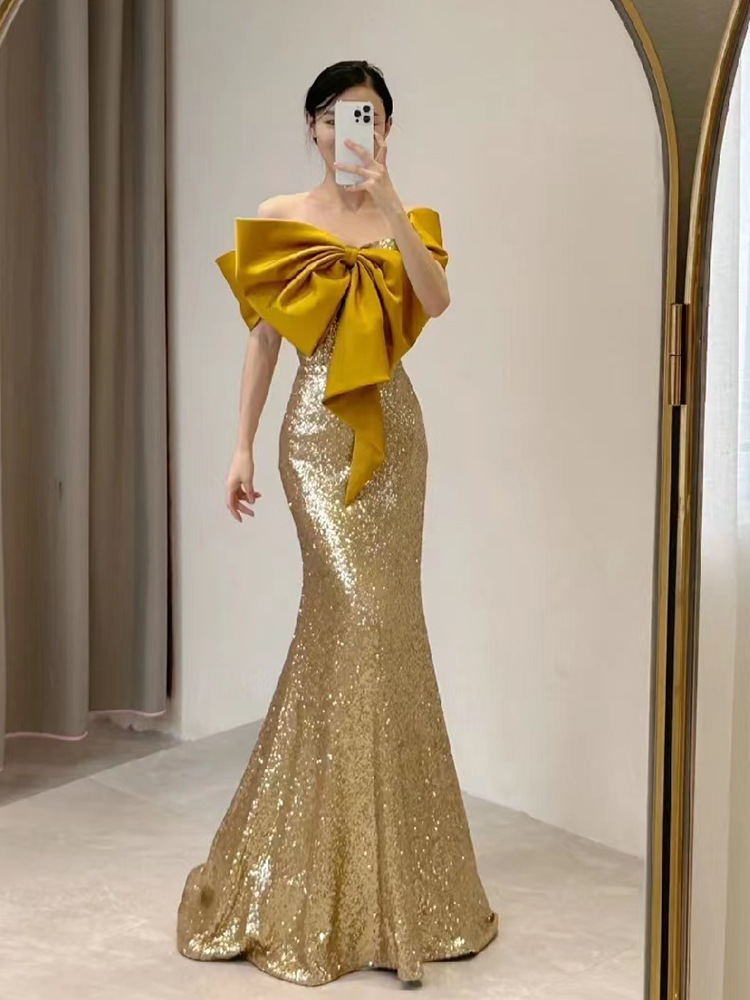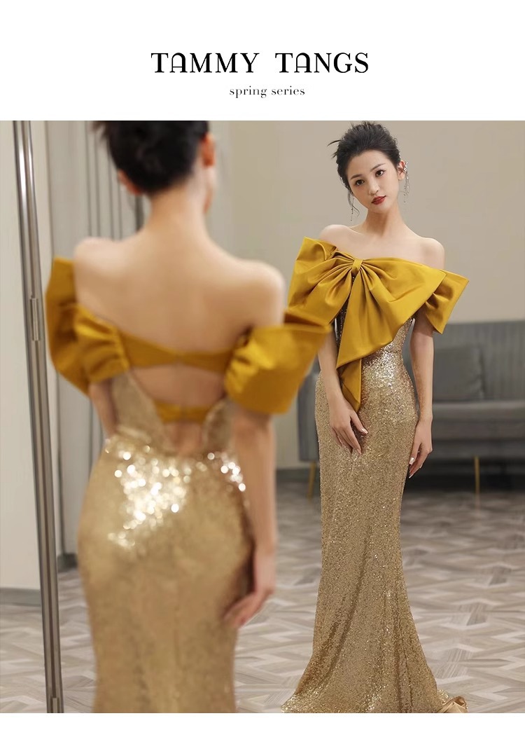 ワンショルダーイブニングドレス 2025 新しい気質ハイエンドライト高級ホストフィッシュテール婚約宴会スパンコールドレス
