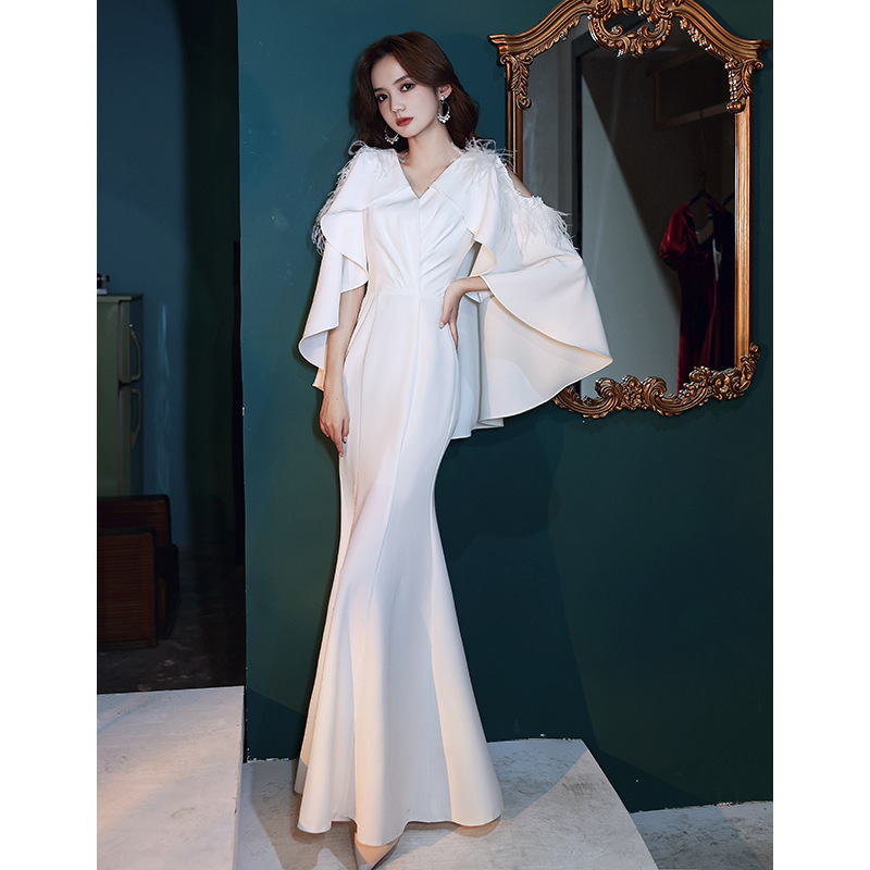 白いタキシードのスカートの女性2025の新型の名媛の宴会の高級な気質の長い金の修身の魚の尾の司会者のセクシーさ