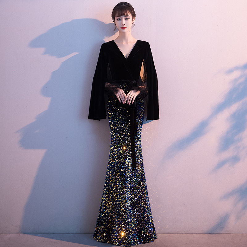 2025年冬新作 宴会用イブニングドレス 女性用 長袖ドレス エスカピエントプリンセス風 エレガントな司会者向け年次総会ドレス