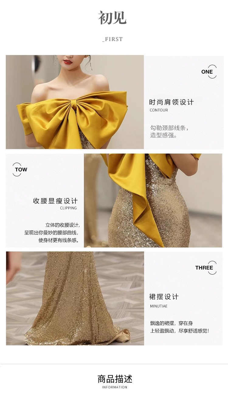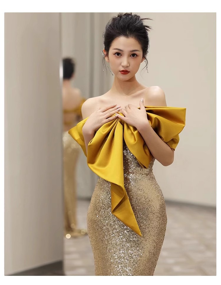 金色のタキシードの女性の高級感の宴会の司会者のハイエンドの軽い豪華な大衆の年次総会の明るい魚の尾のスカートの敬酒服