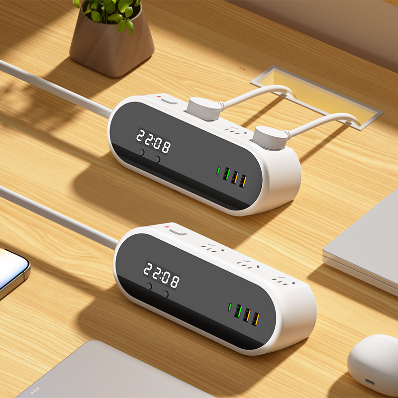 谷牛多功能桌面插座带时钟显示多孔USB快充插排排插接线板防过载