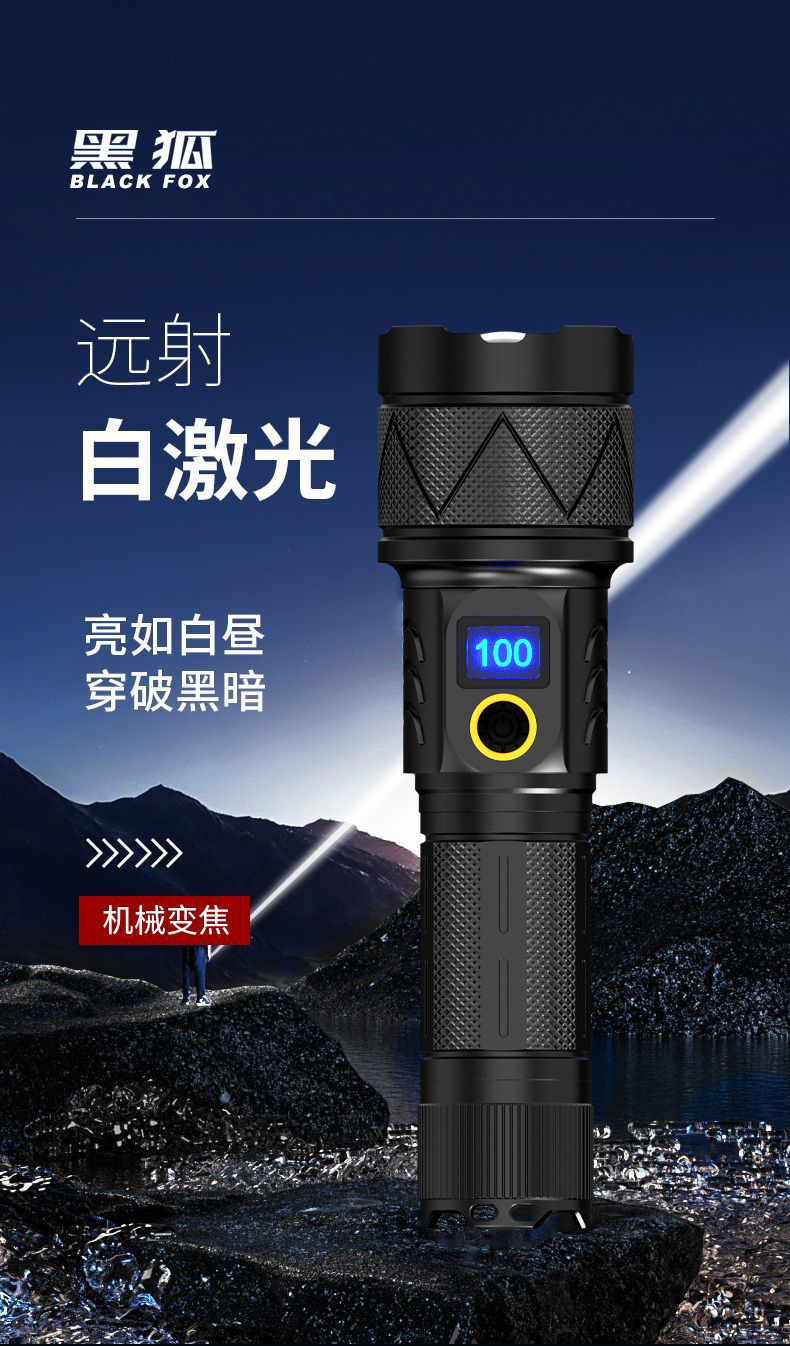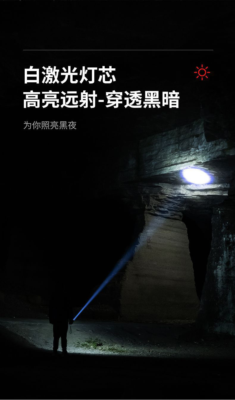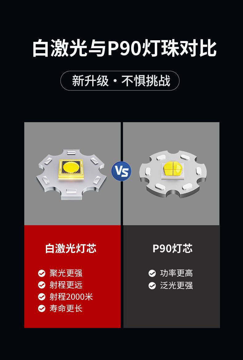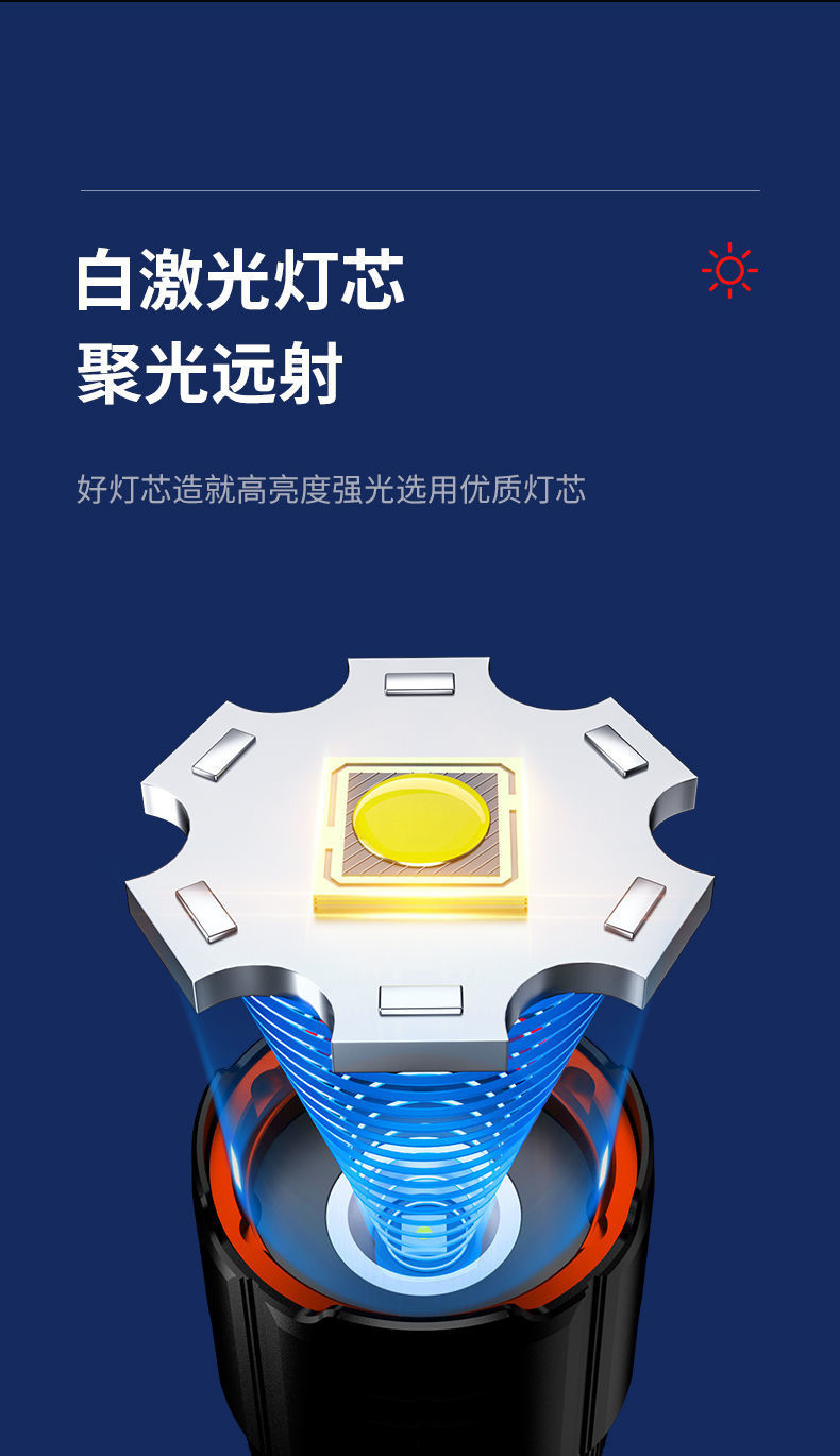 白いレーザーの強い光の超明るい懐中電灯の遠射の屋外のキャンプの家庭用充電の大きい電力の携帯用ライトのズームの新型