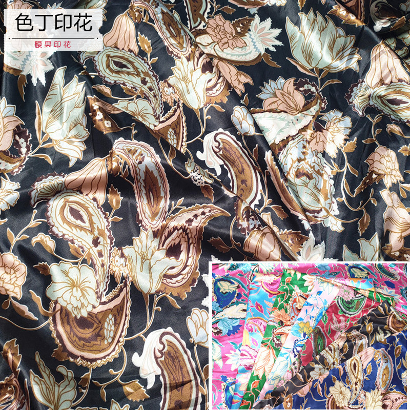 现货新款腰果印花色丁面料 涤纶仿真丝服装里布丝巾飘带表演服布