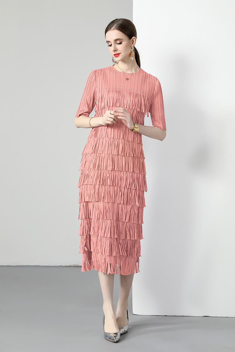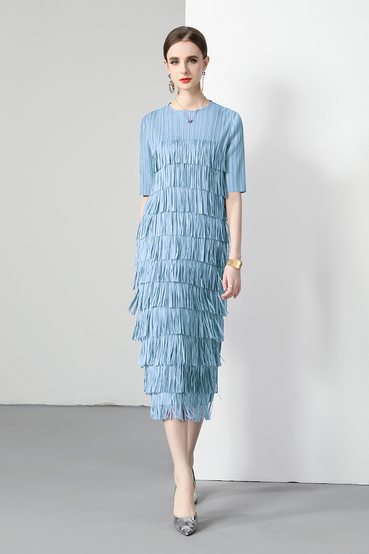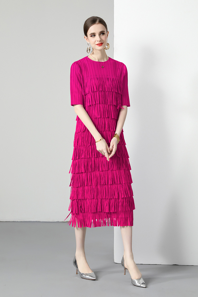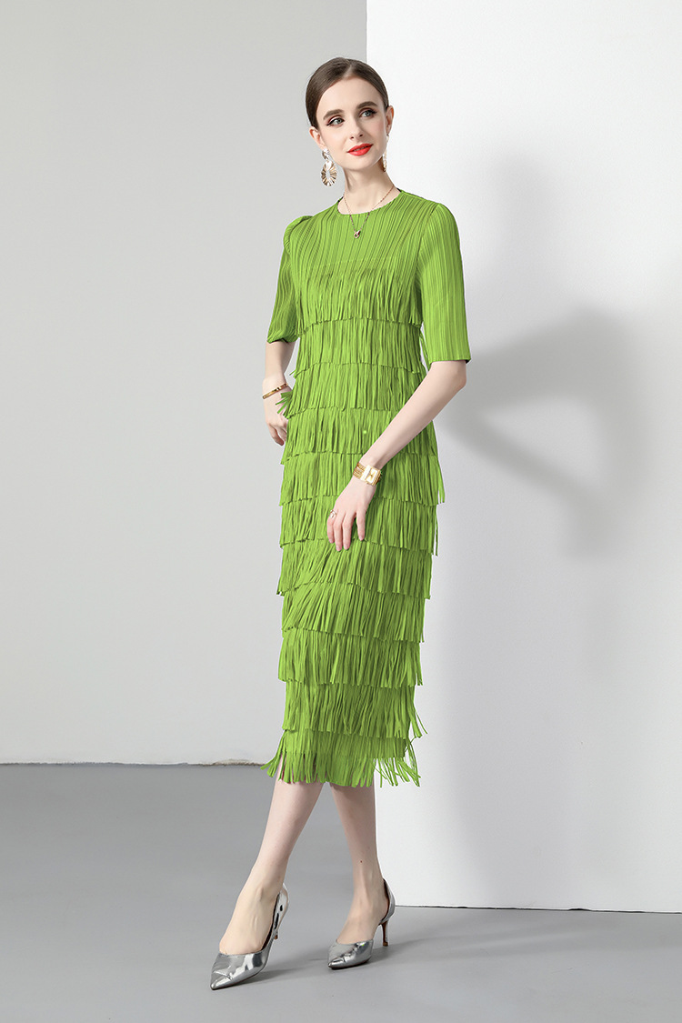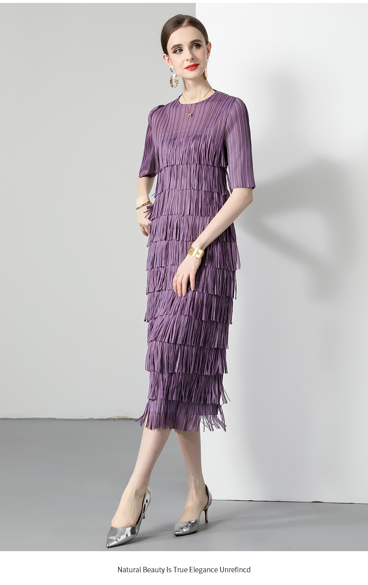三宅純色シワワンピース夏ファッション着痩せ高級感フリンジロングスカート弾力大きいサイズ婦人服スカート