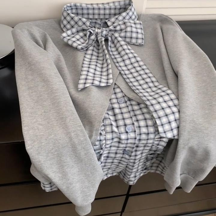 韩系格子拼接假两件长袖衬衫春秋轻熟风气质休闲百搭显瘦衬衣上衣
