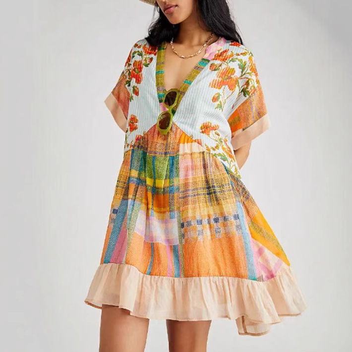 ヨーロッパとアメリカの女性向け、ボヘミアン風プリント半袖ポケット付きVネックフリルコントラストカラーワンピース、在庫あり