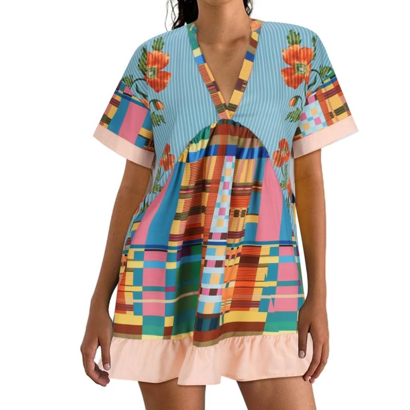 2025年越境アマゾン夏物シフォンVネックボヘミアン風レディース半袖フリル配色ワンピース