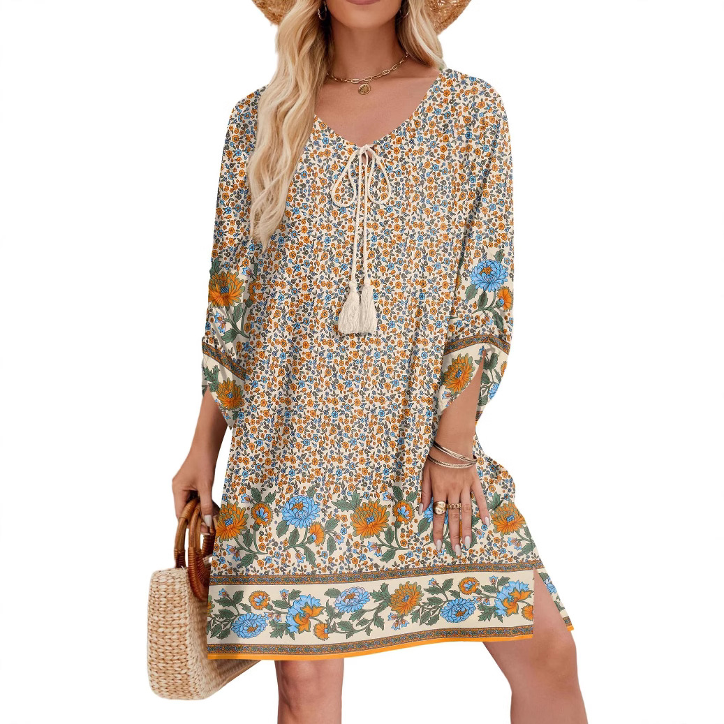 欧米クロスボーダーレディース新作春夏秋物ボヘミアン風自然成長花柄プリント七分袖vネック