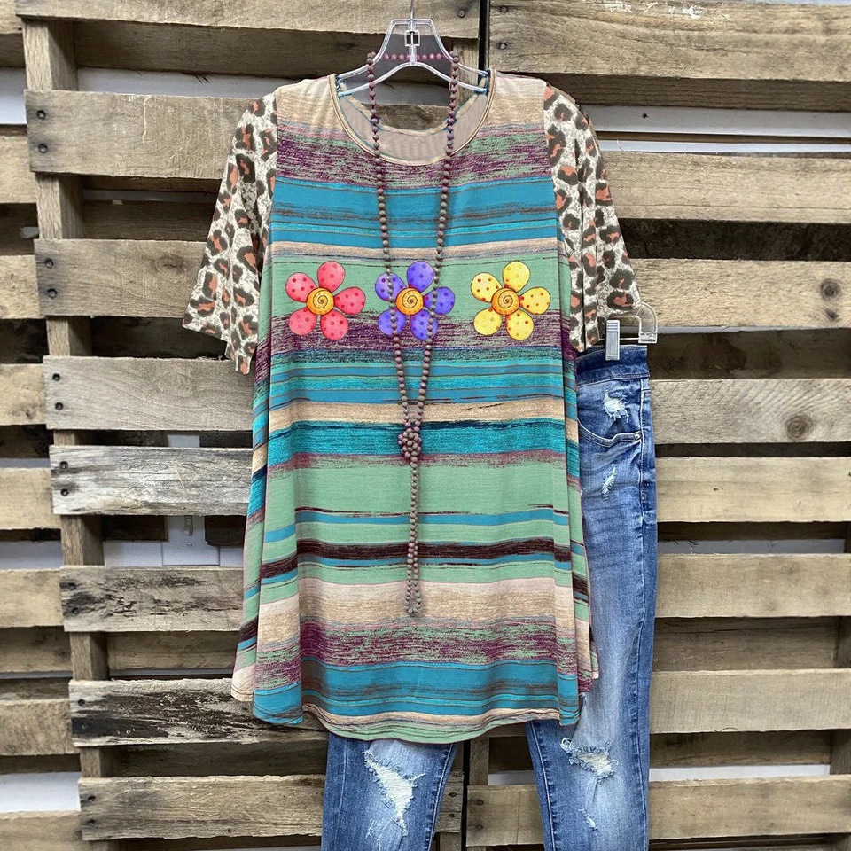 2025跨境TEMU欧美大码女装 彩色条纹印花宽松豹纹拼接短袖T恤女