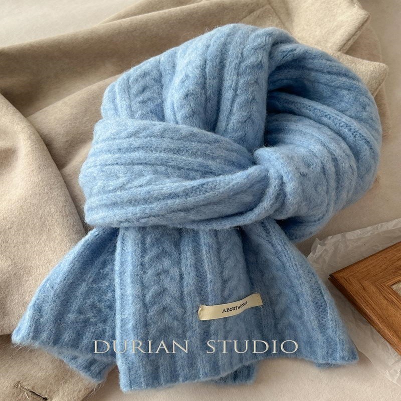 显白冰蓝色~韩系ins软糯麻花纹针织围巾冬季男女学生百搭围脖护颈
