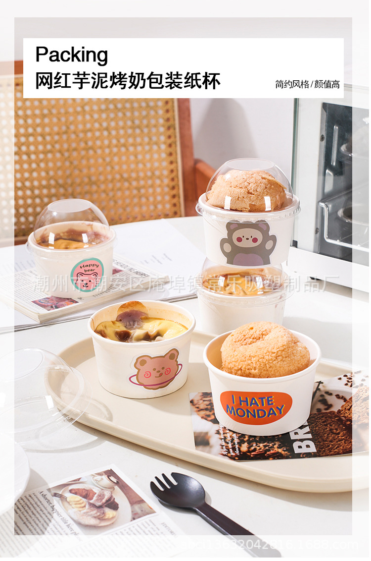 サトイモの焼きミルクの箱のメレンゲの大きいシュークリームの杯は甘いものを焼いて卵のミルクのプリンを焼きます。