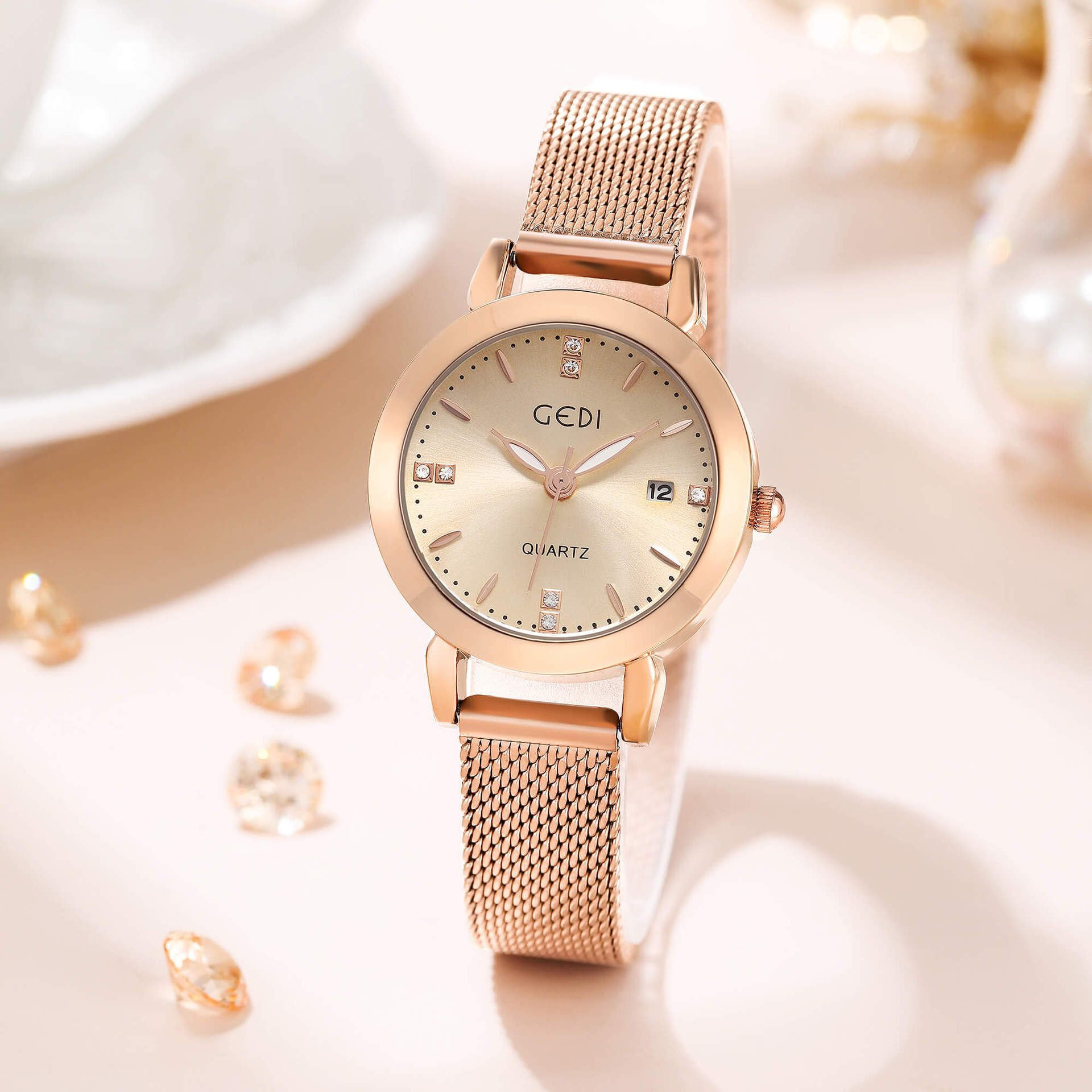 歌迪の新型の軽い豪華なダイヤモンドのカレンダーの女性のファッションの高い顔の値の防水のステンレスのネットは石英の腕時計を持ちます。