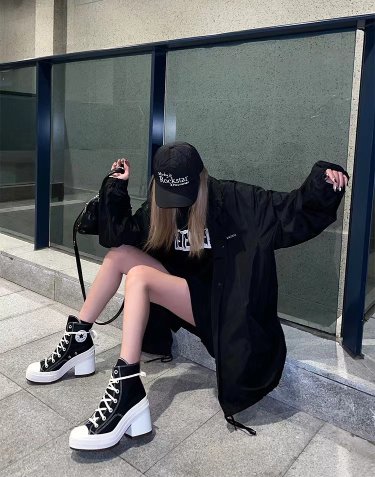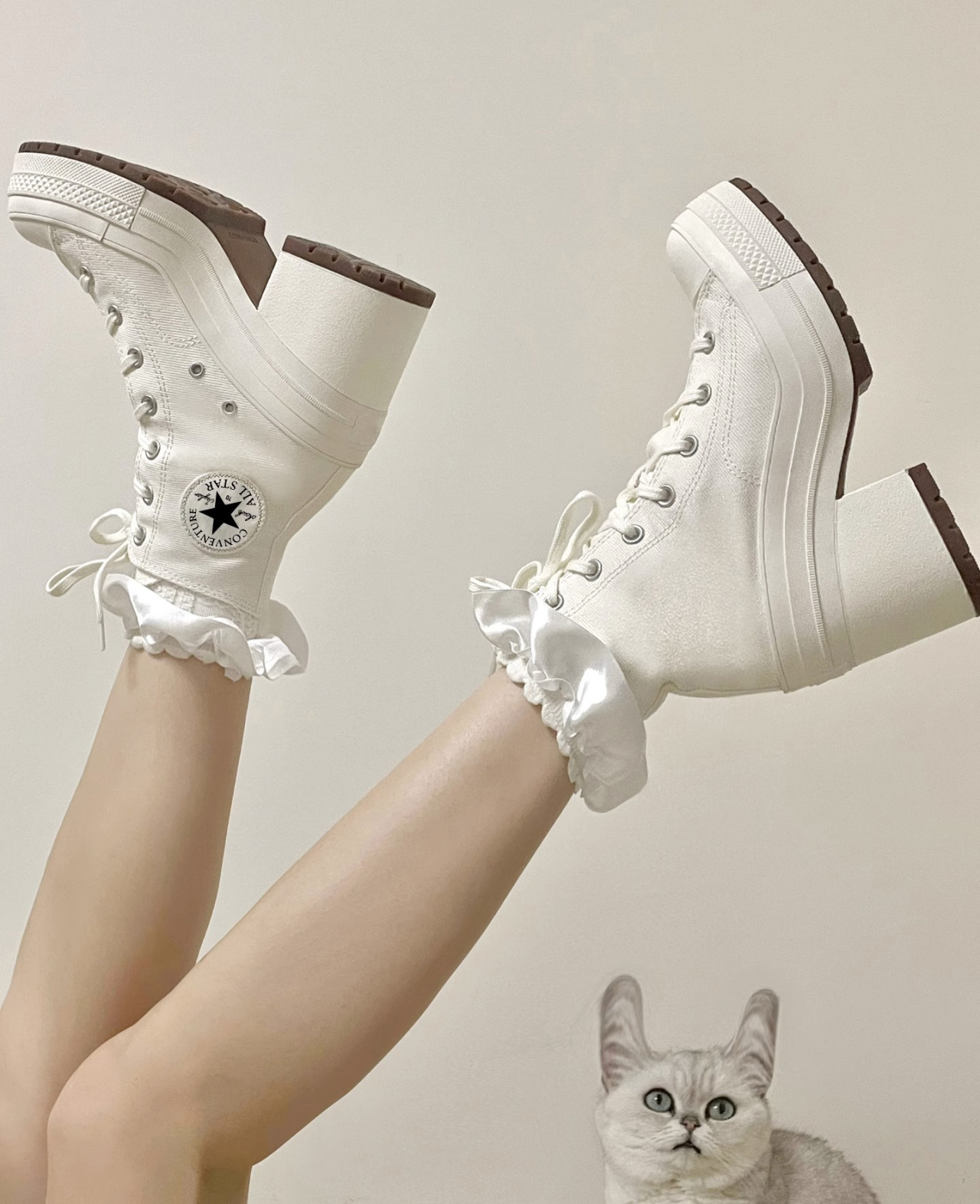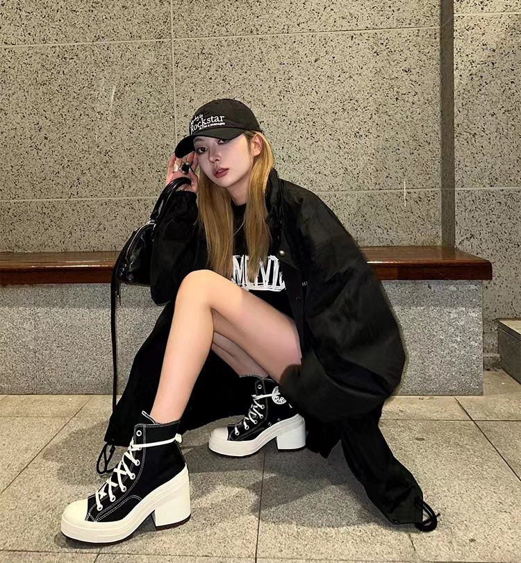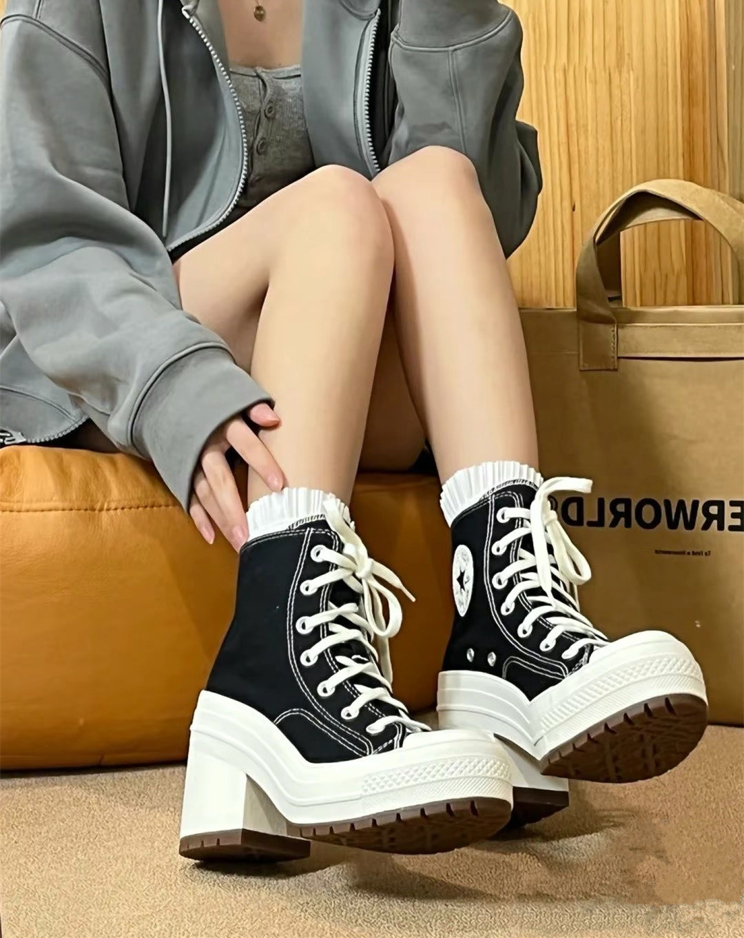 レトロハイヒール厚底キャンバスシューズ女性用 2025 新しいラウンドトゥレースアップ多用途厚底ハイトップシューズ白靴