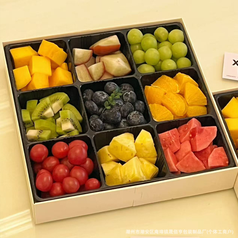 インターネット有名人 Jiugongge フルーツカット包装箱紙プラスチック大きな正方形の果物と野菜の生の果物 4 分割包装箱商業用