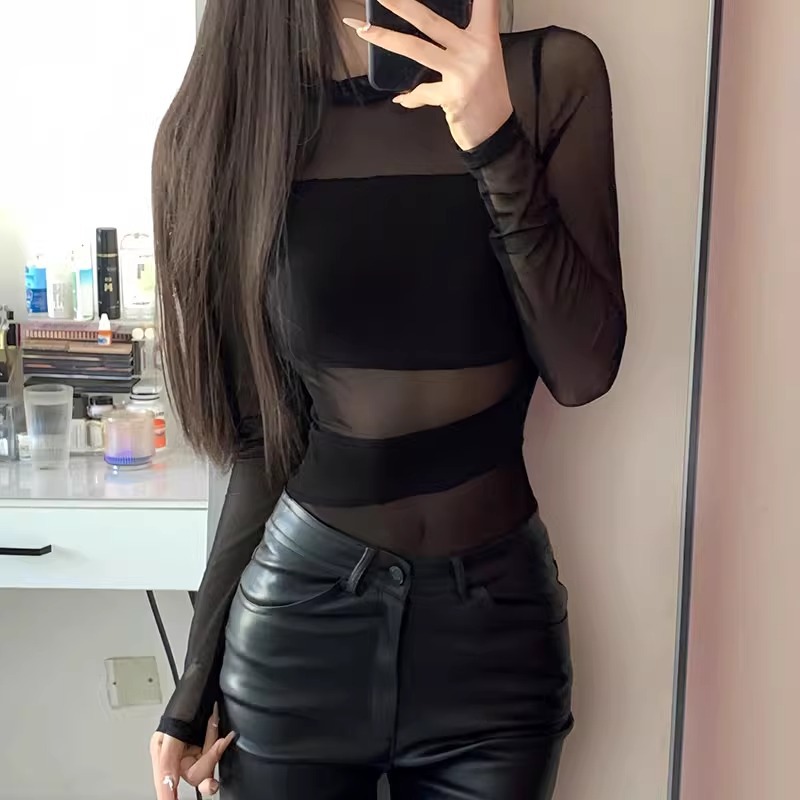 欧品ins黒透視網紗長袖tシャツ女性セクシー修身スタイルの透かし彫りのワンピース春夏