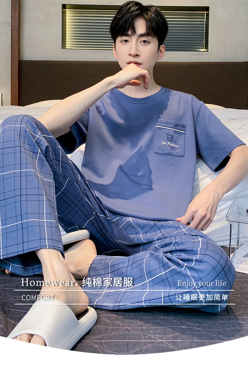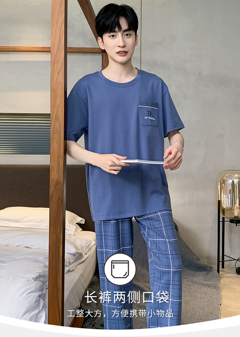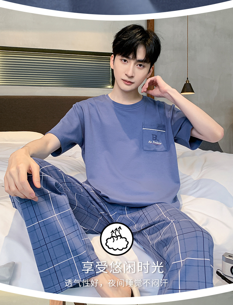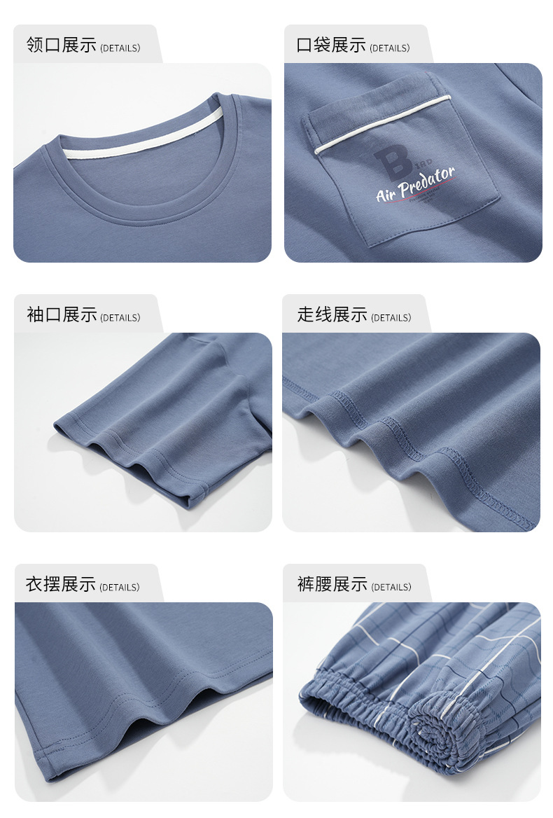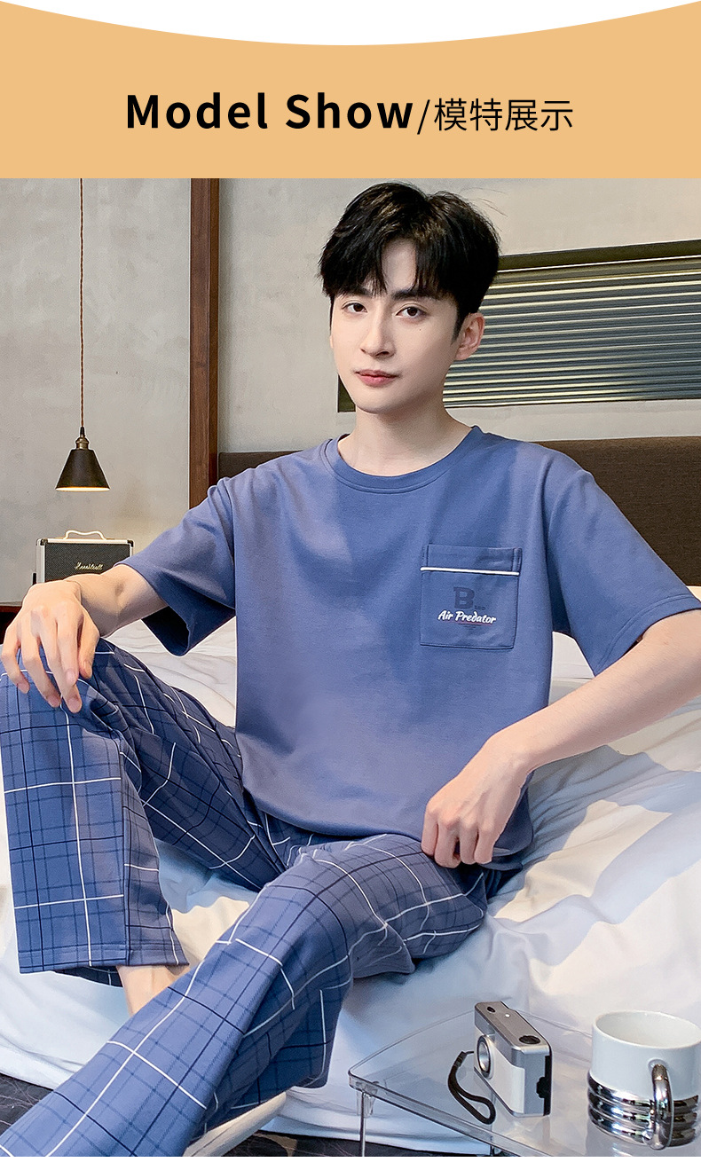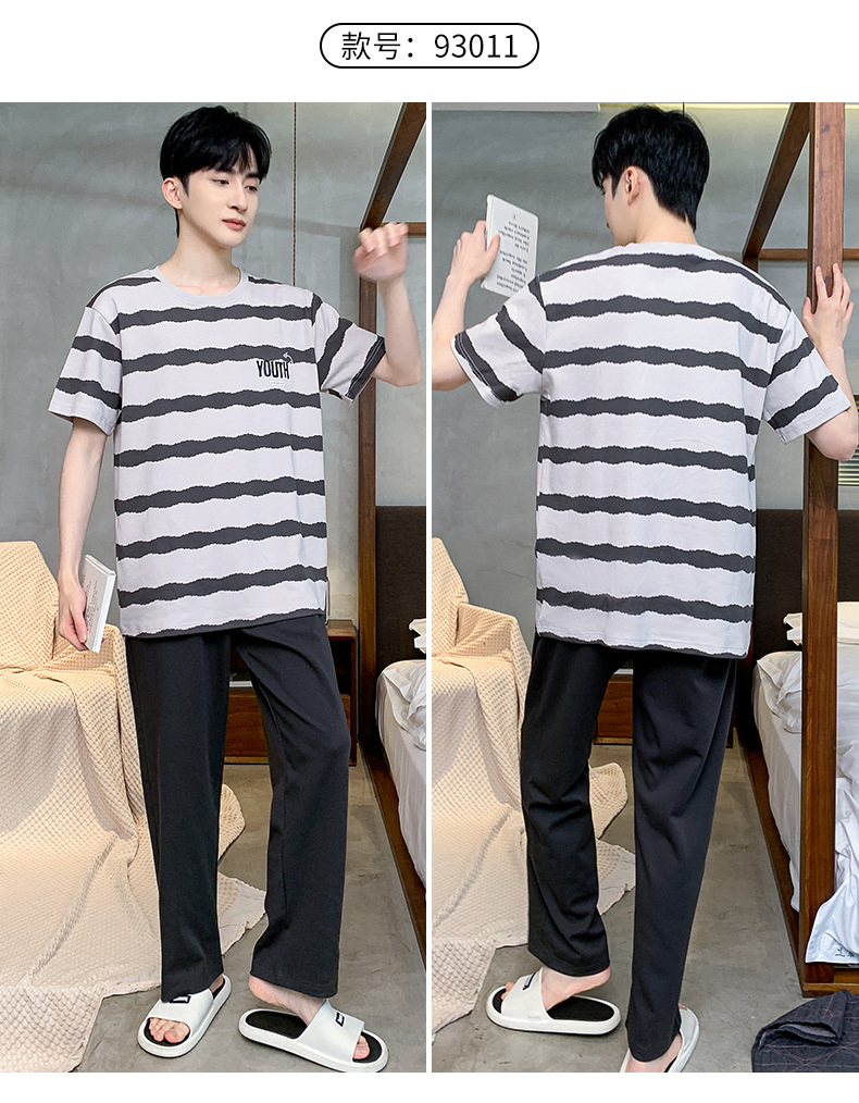純綿男性パジャマ夏の新型丸首カジュアルサイズは綿半袖ズボンの家庭服セットを着ることができます。