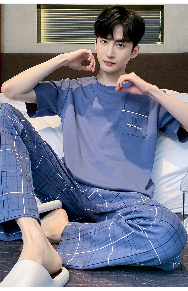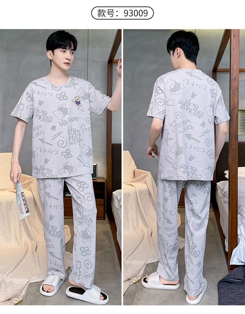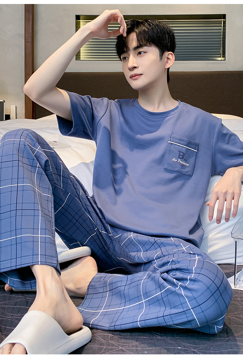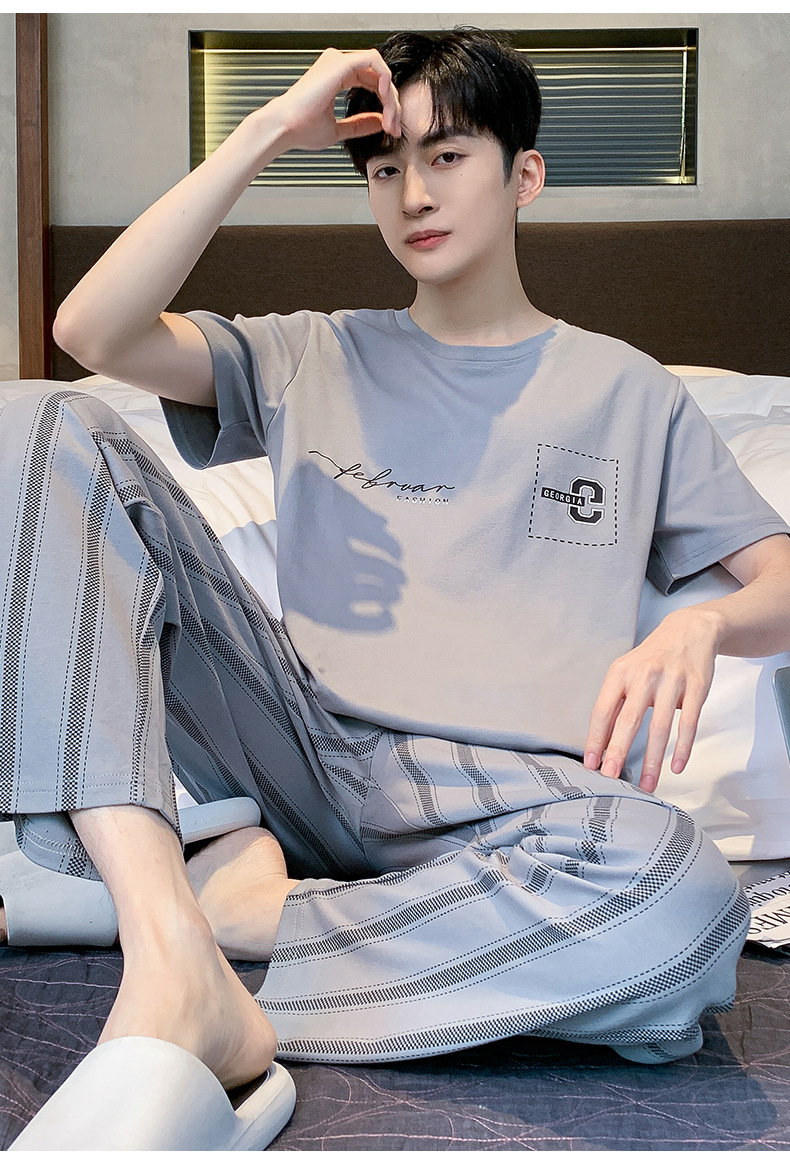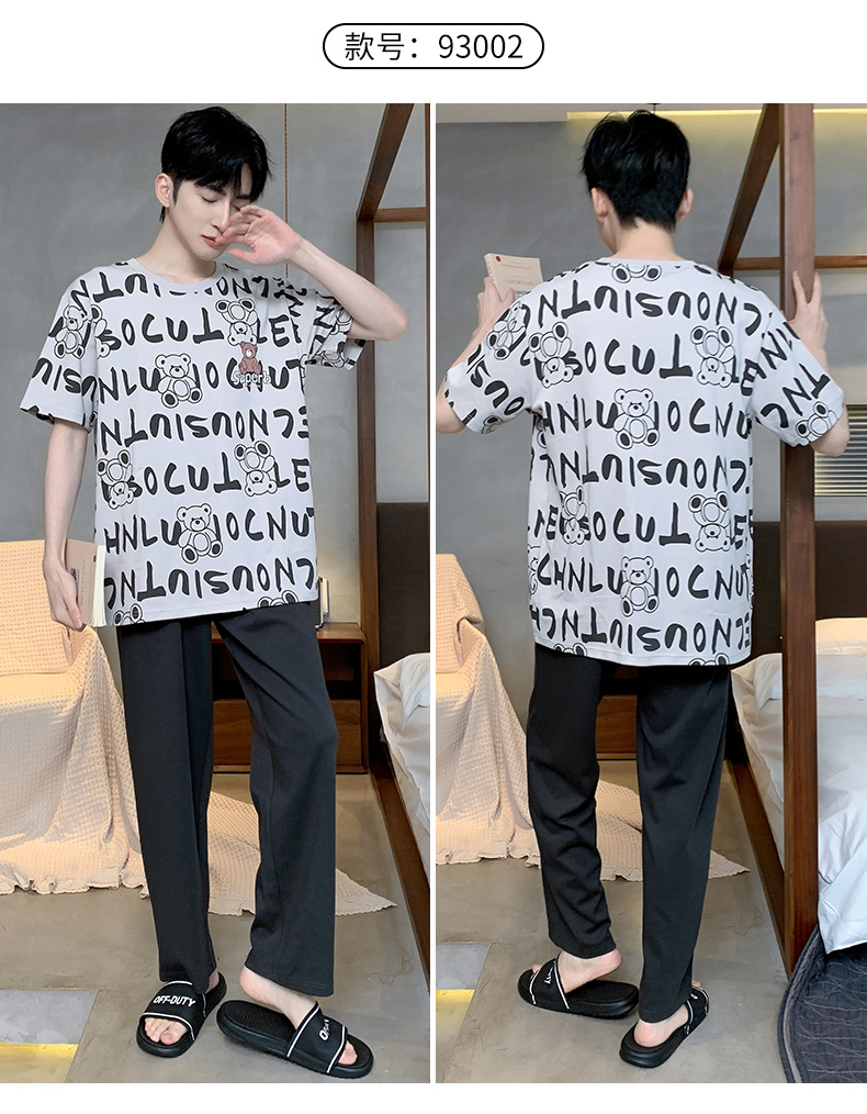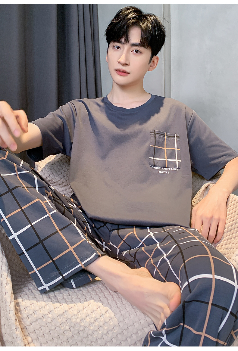 純綿男性パジャマ夏の新型丸首カジュアルサイズは綿半袖ズボンの家庭服セットを着ることができます。